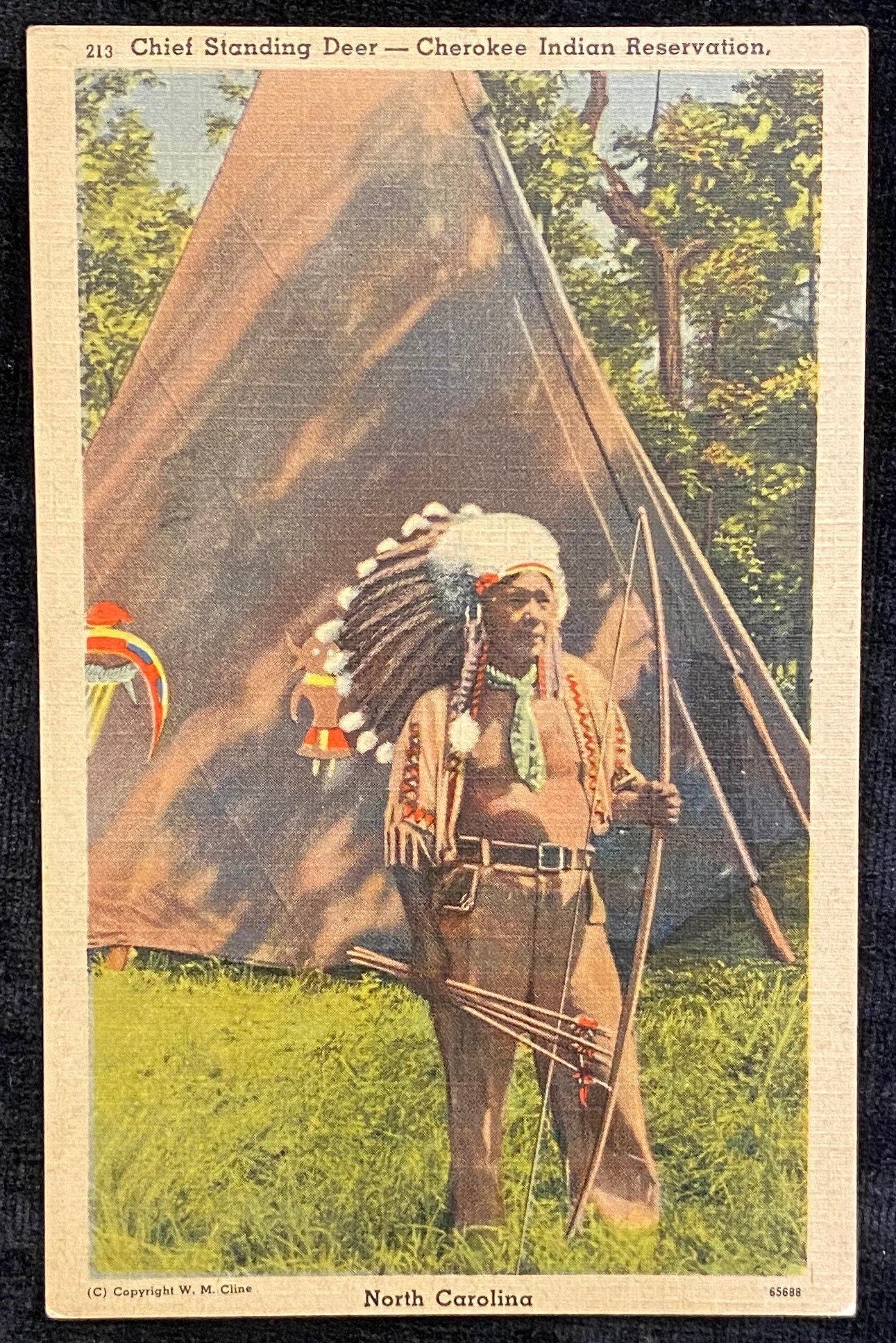 Chief Standing Deer - Cherokee Indian Reservation - North Carolina - 1930s Linen Postcard