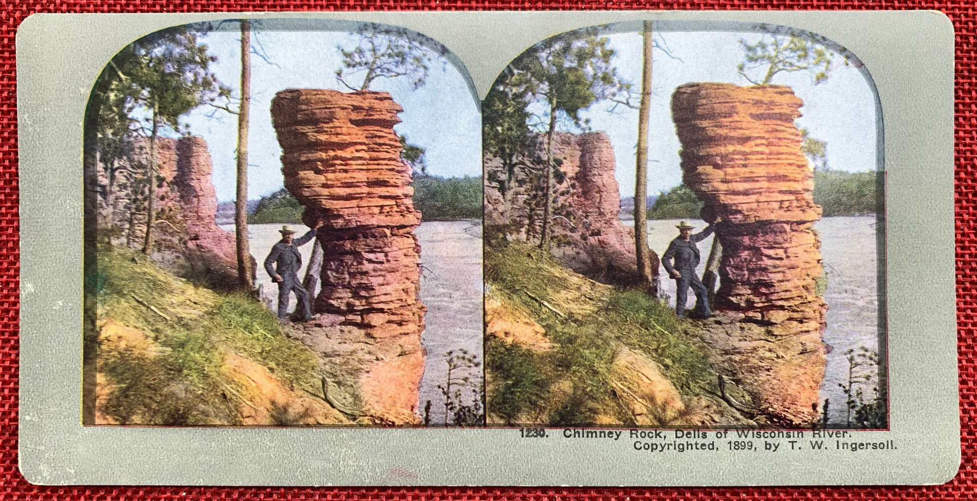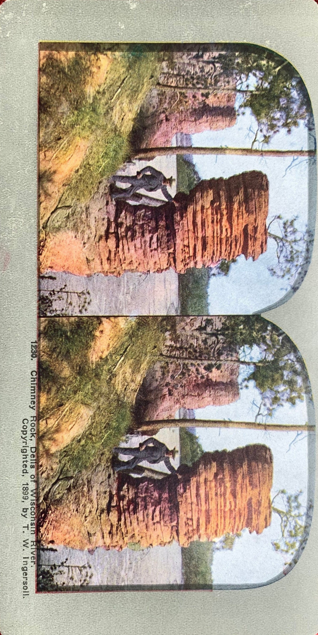 This vintage stereo view card features two color images of Chimney Rock in the Wisconsin Dells.