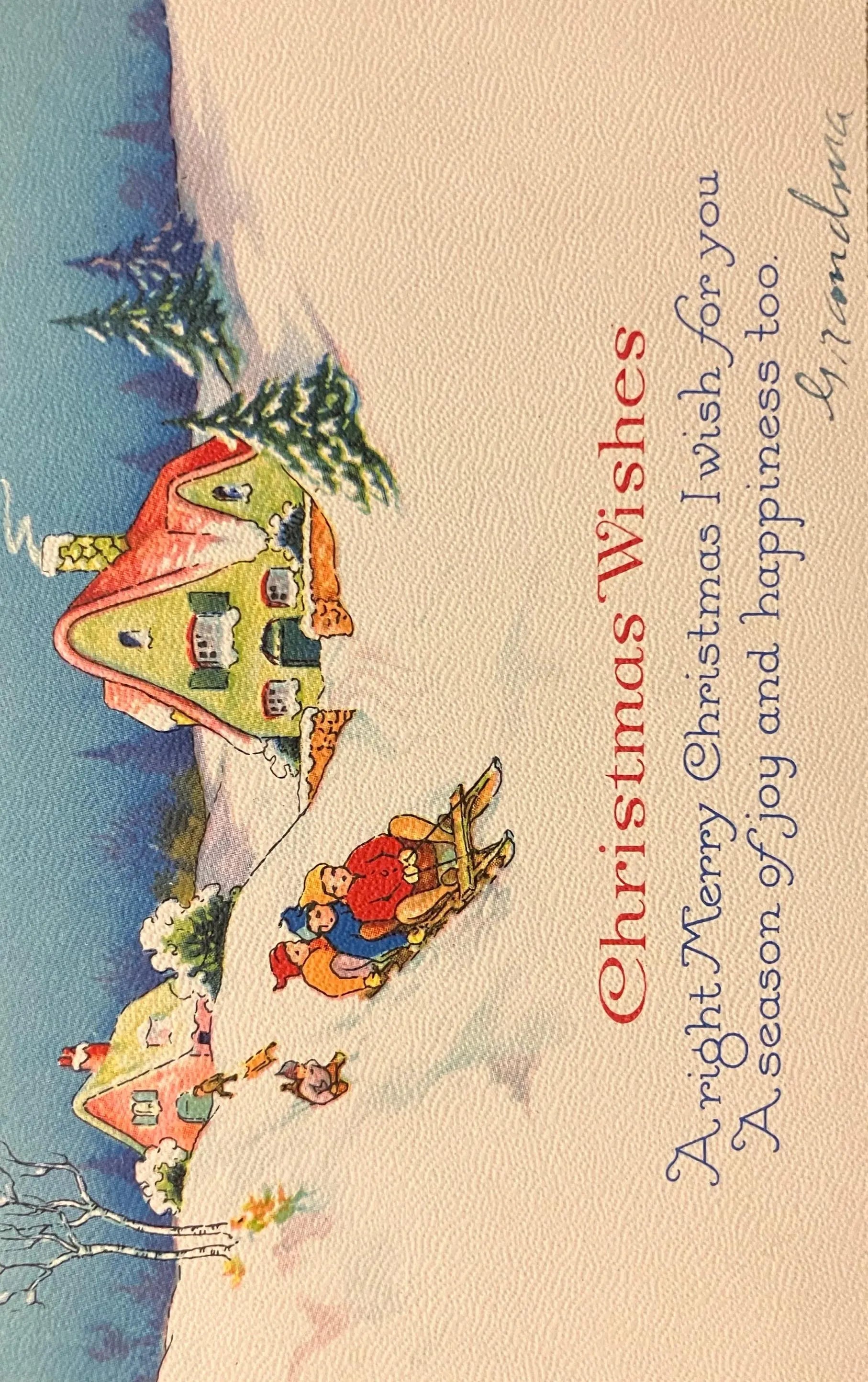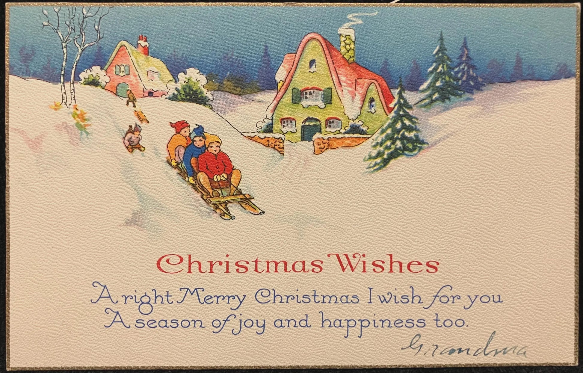 On front: Christmas Wishes - A right Merry Christmas I wish for you A season of joy and happiness too. “Grandma” written