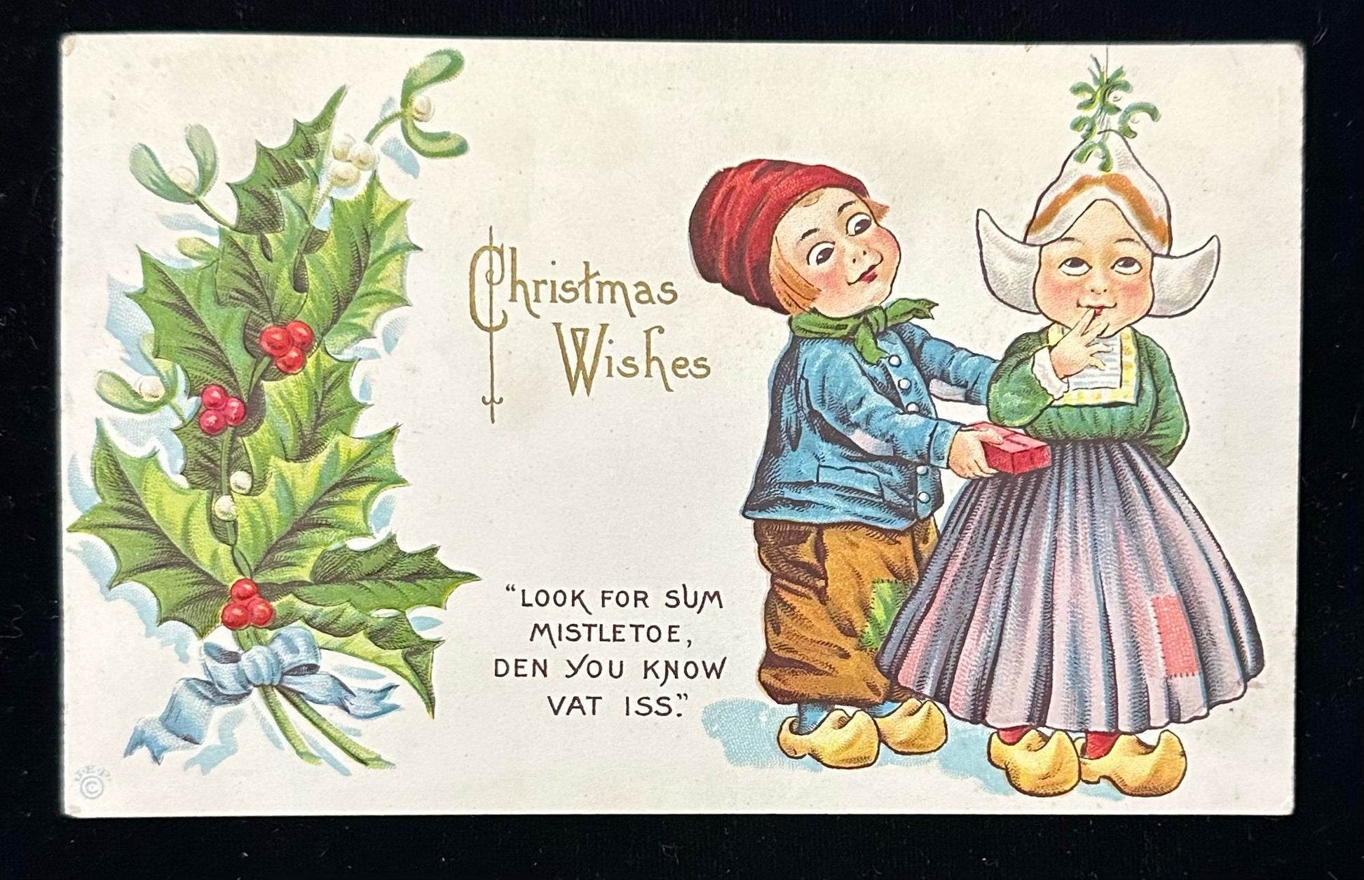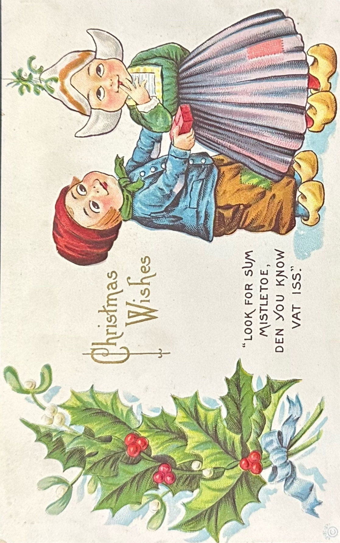 Christmas Wishes- "Look for sum mistletoe, den you know vat iss." The Art is very much like the Dutch Valentines sold in the 1920.
