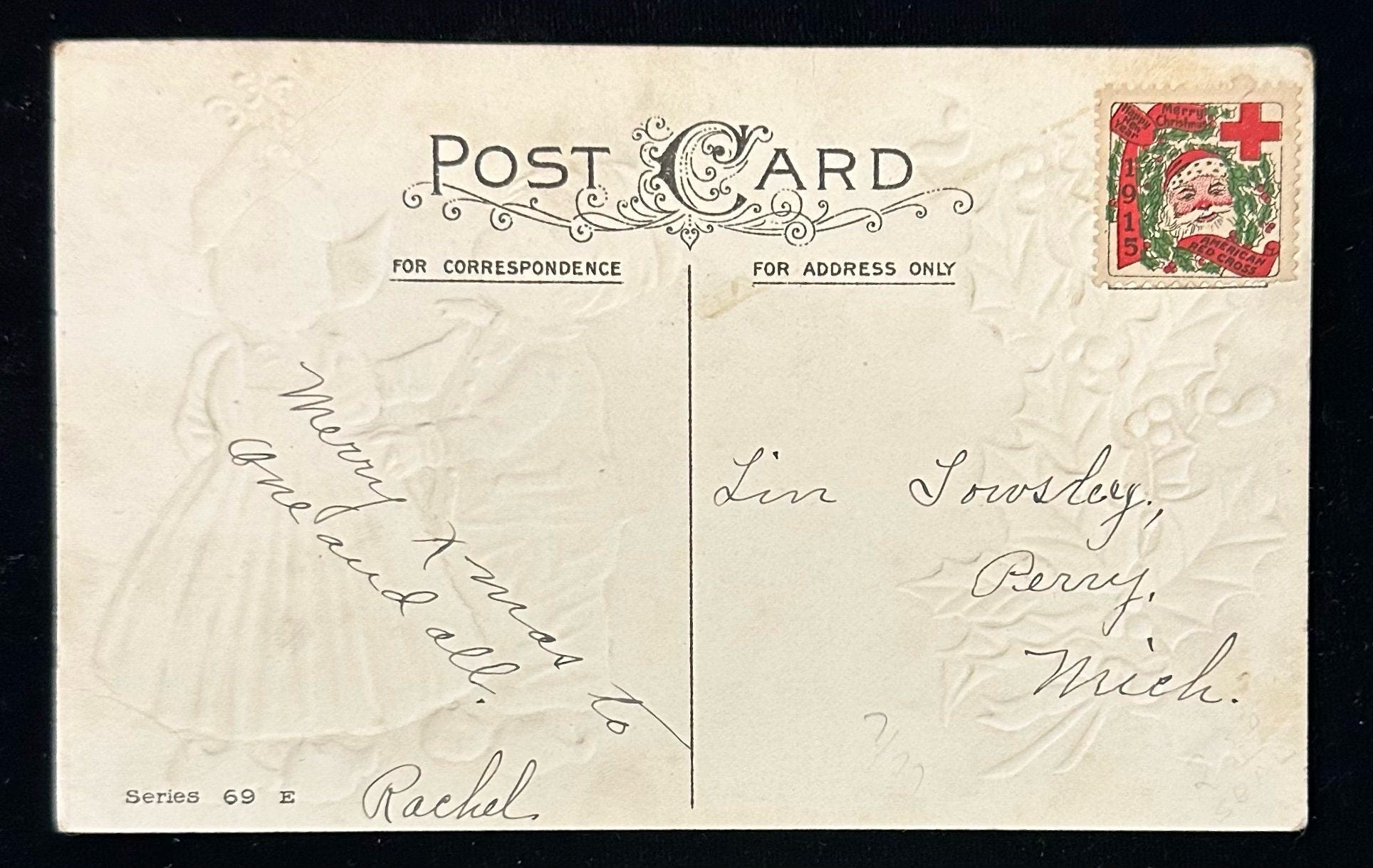 Mailed: Postcard has 1915 American Red Cross sticker instead of stamp. (Santa Clause American Red Cross Stamp)