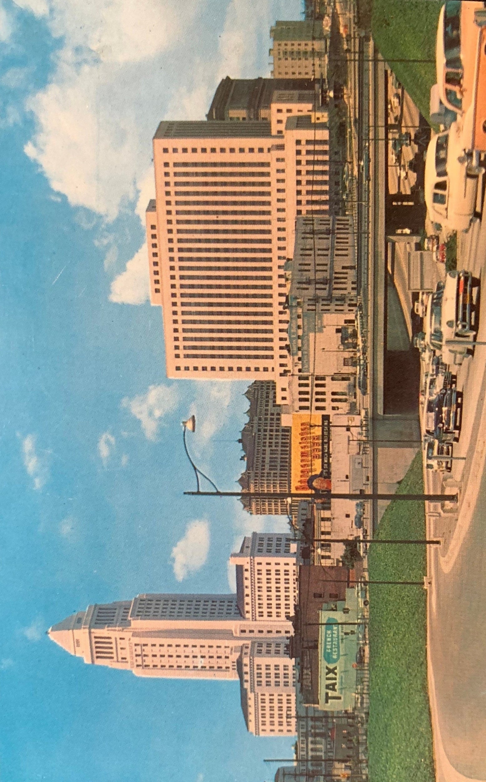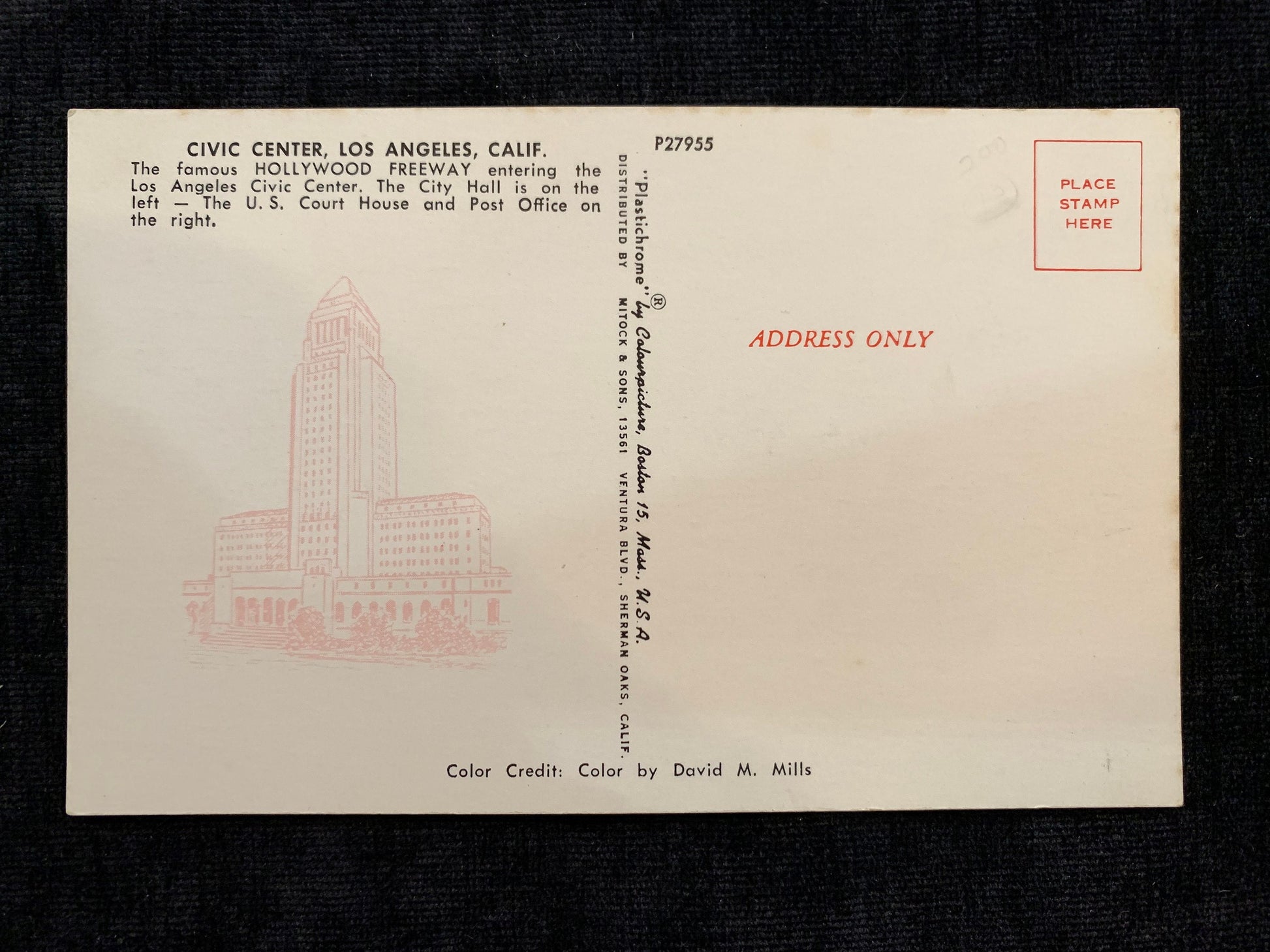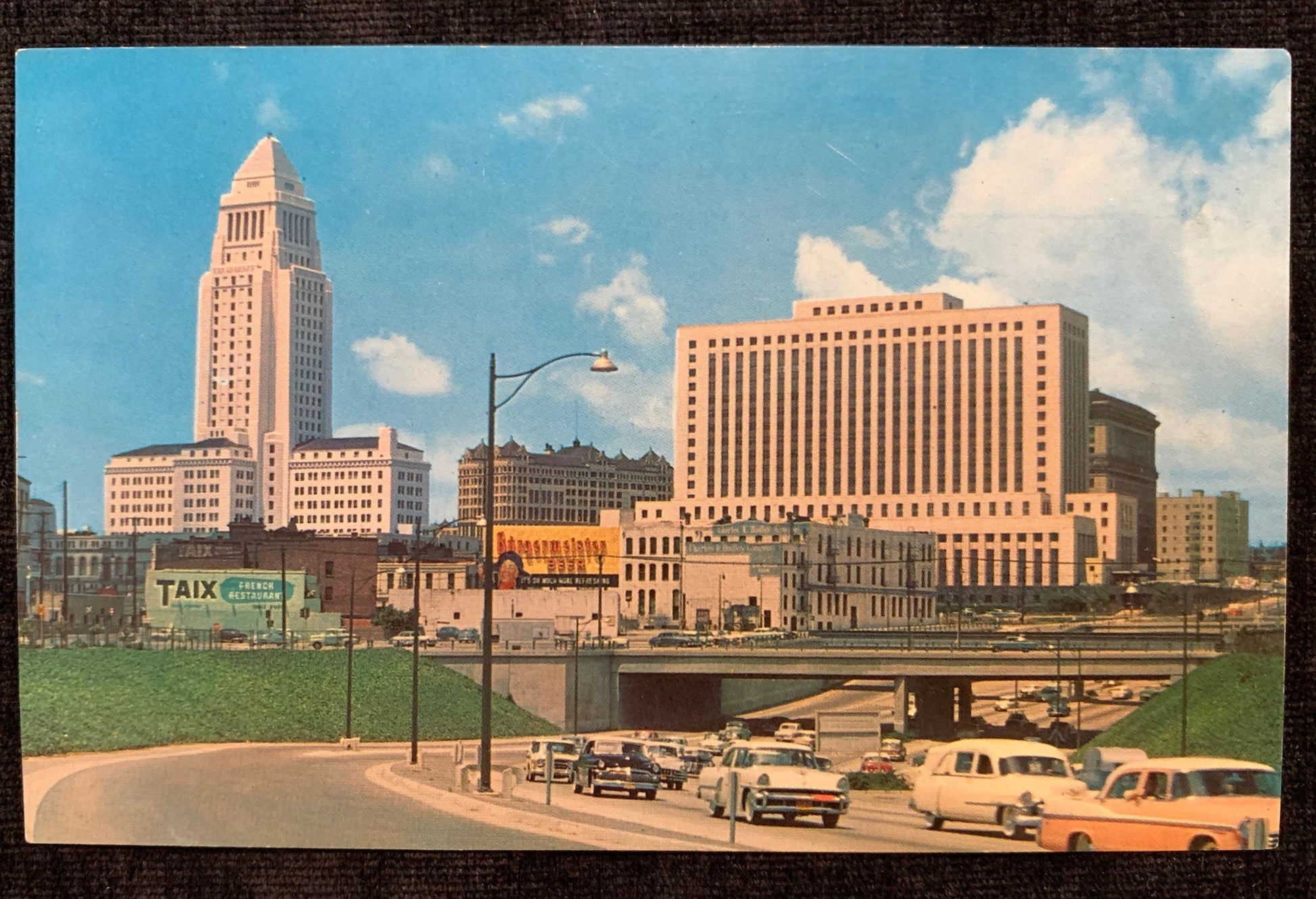 Back Text: "Civic Center, Los Angeles, Calif. | The famous Hollywood Freeway entering the Los Angeles Civic Center. The City Hall is on the left - The U.S. Court House and Post Office on the right."