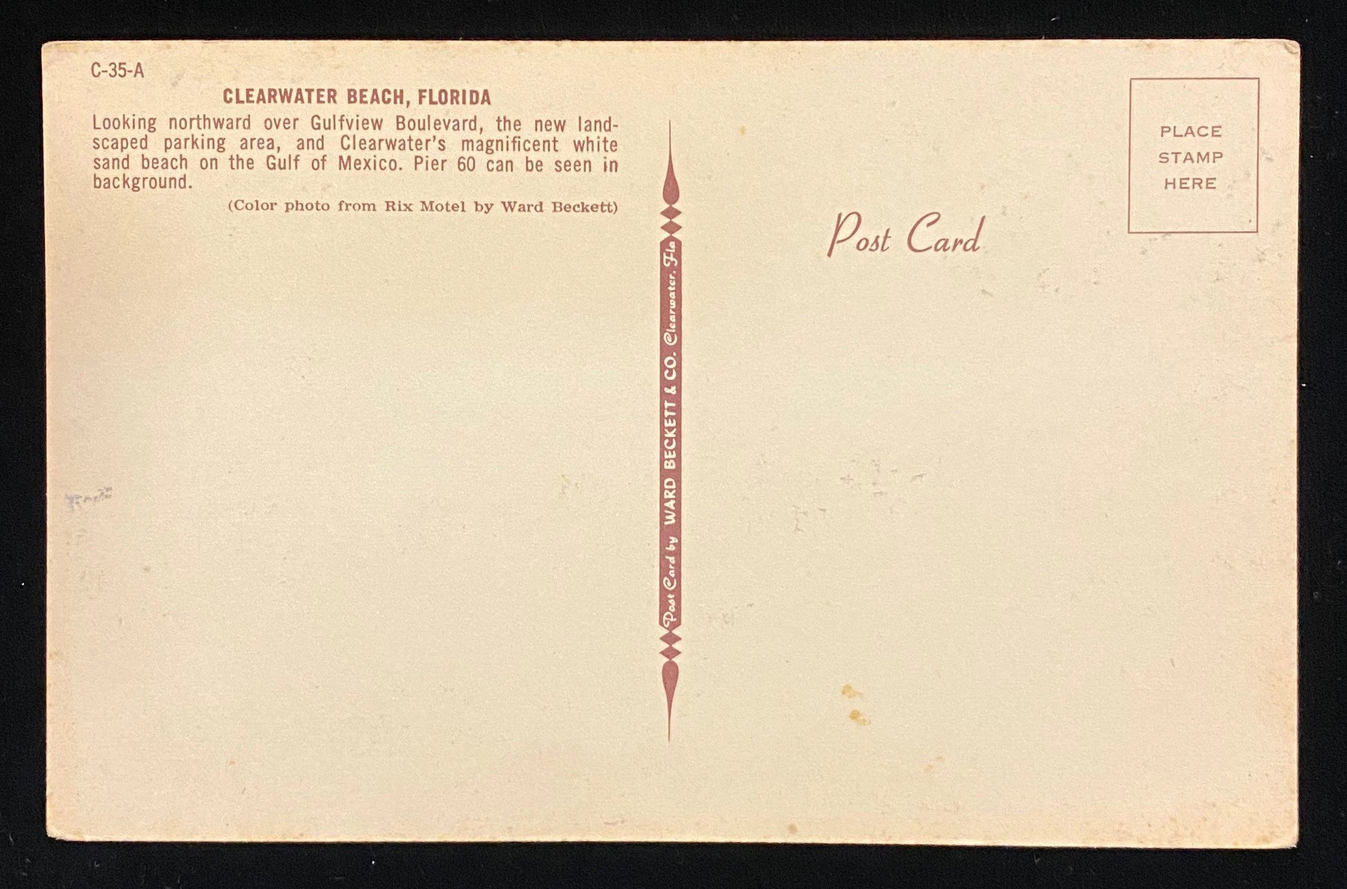 Back Information: "Clearwater Beach, Florida. Looking northward over Gulfview Boulevard, the new landscaped parking area, and Clearwater's magnificent white sand beach on the Gulf of Mexico. Pier 60 can be seen in background."