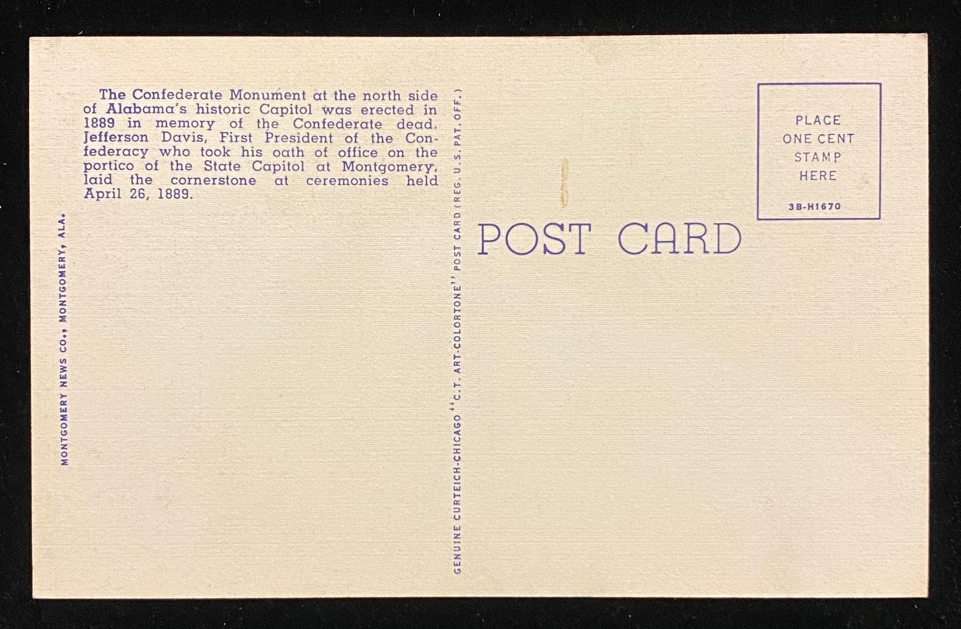 Back Information: "The Confederate Monument at the north side of Alabama's historic Capitol was erected in 1889 in memory of the Confederate dead. Jefferson Davis, First President of the Confederacy who took his oath of office on the portico of the State Capitol at Montgomery, laid the cornerstone at ceremonies held April 26, 1889."