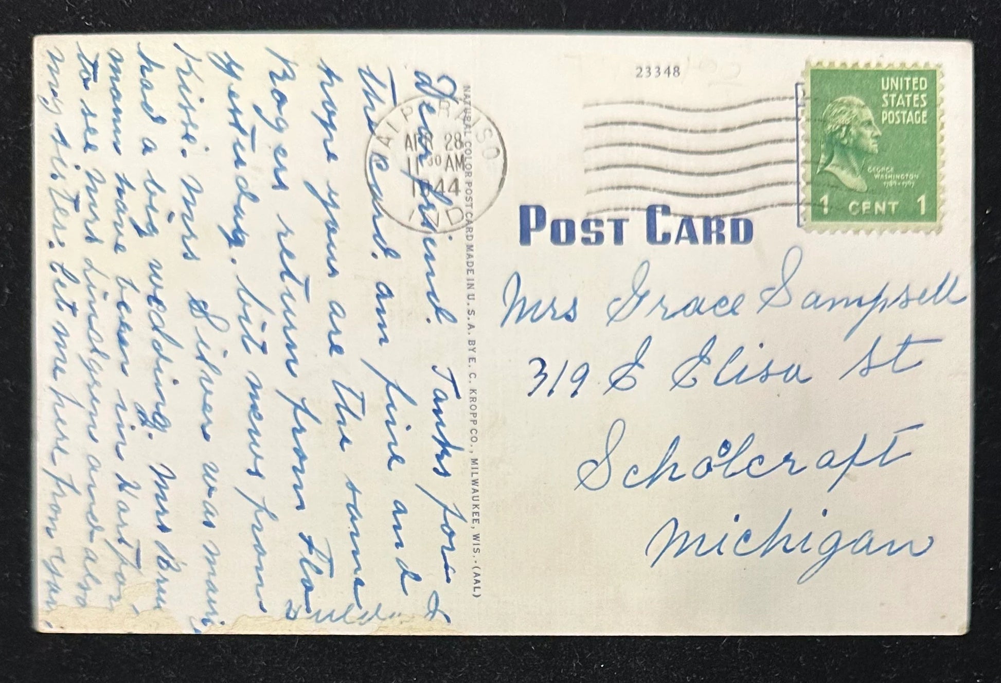 Mailed: Posted on April 28th, 1944 from Valparaiso, Indiana with a green 1 cent George Washington stamp