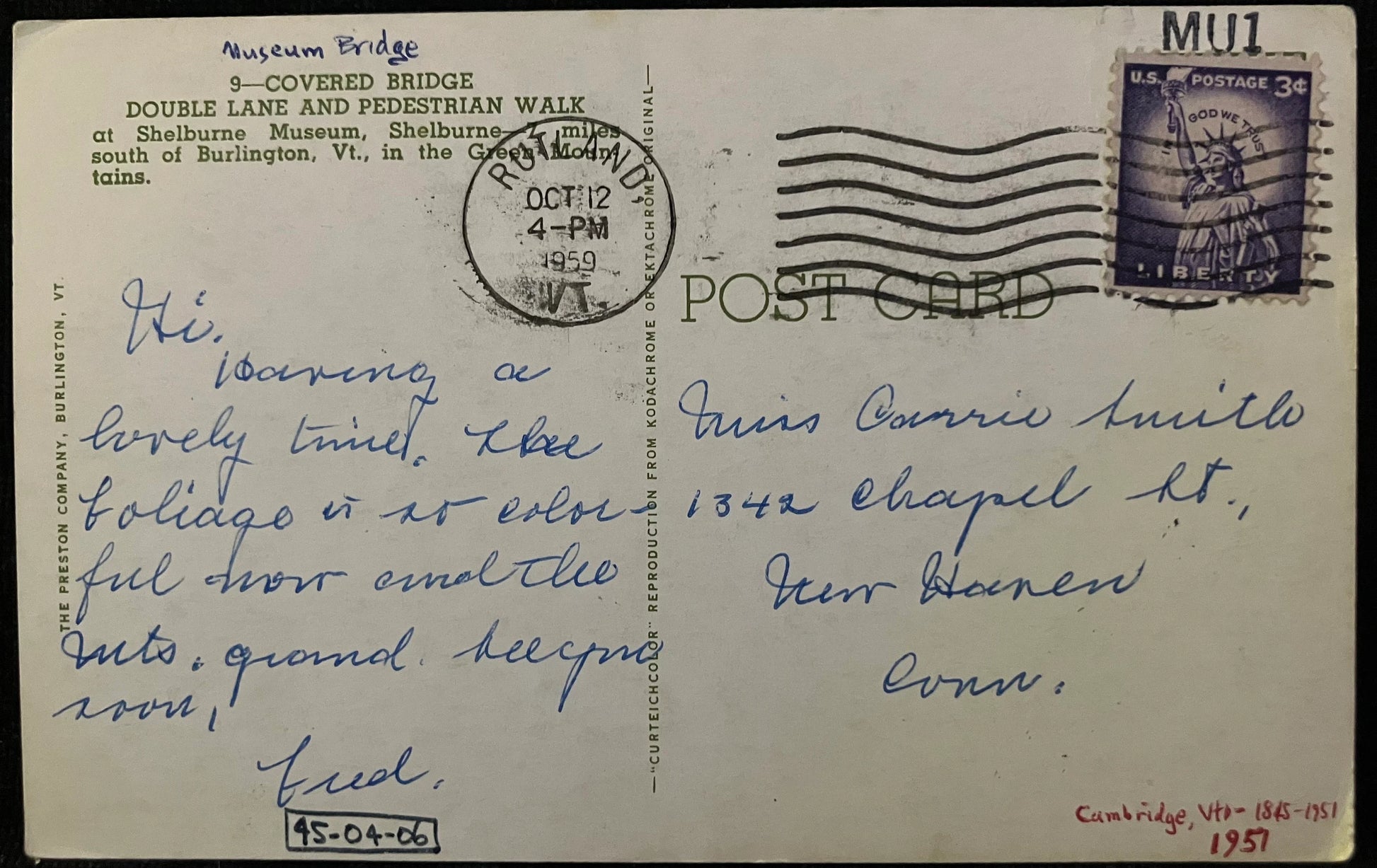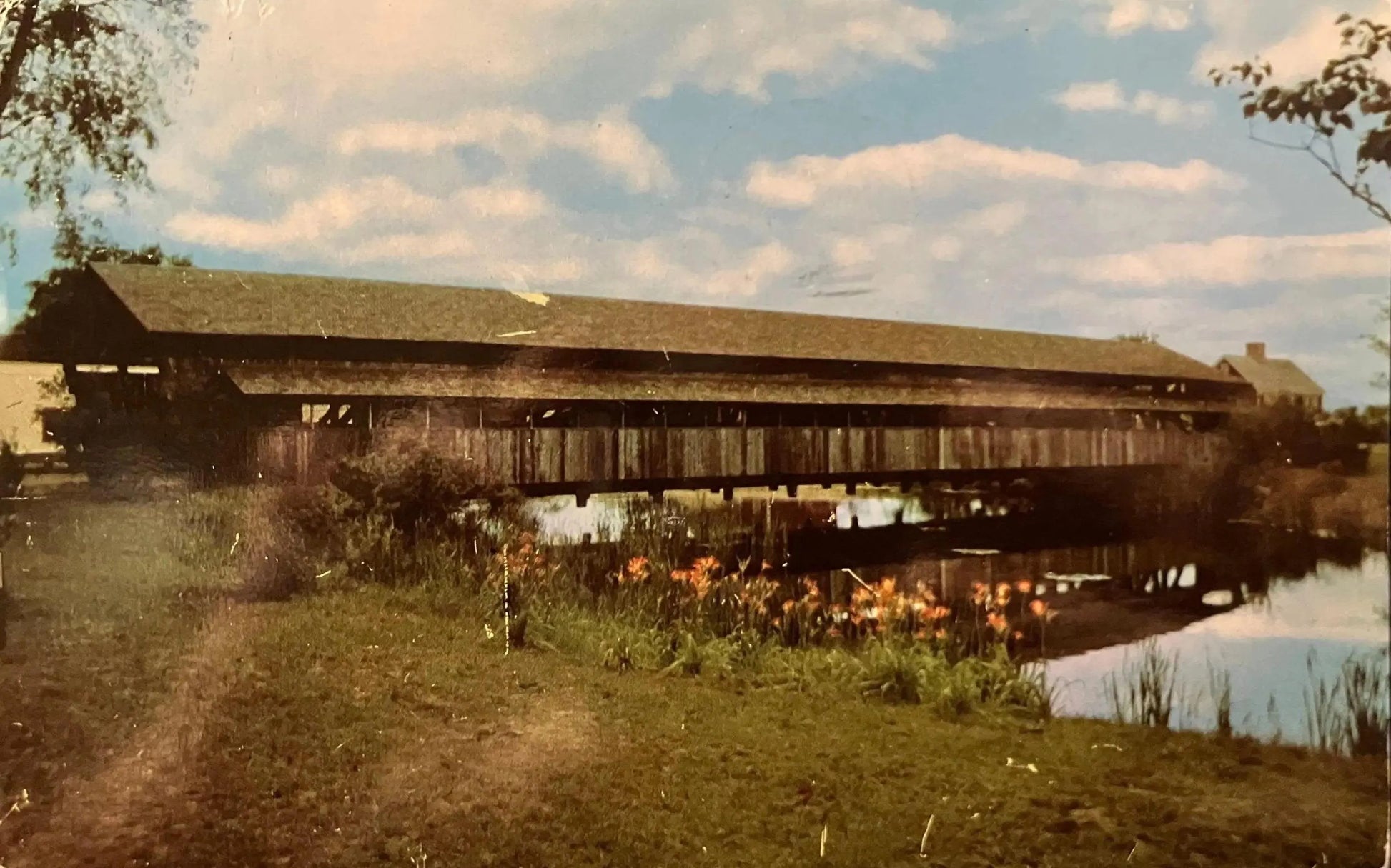 Covered Bridge Double Lane and Pedestrian Walk at Shelburne Museum in Shelburne, Vermont - Vintage 1950s Bridge Postcard