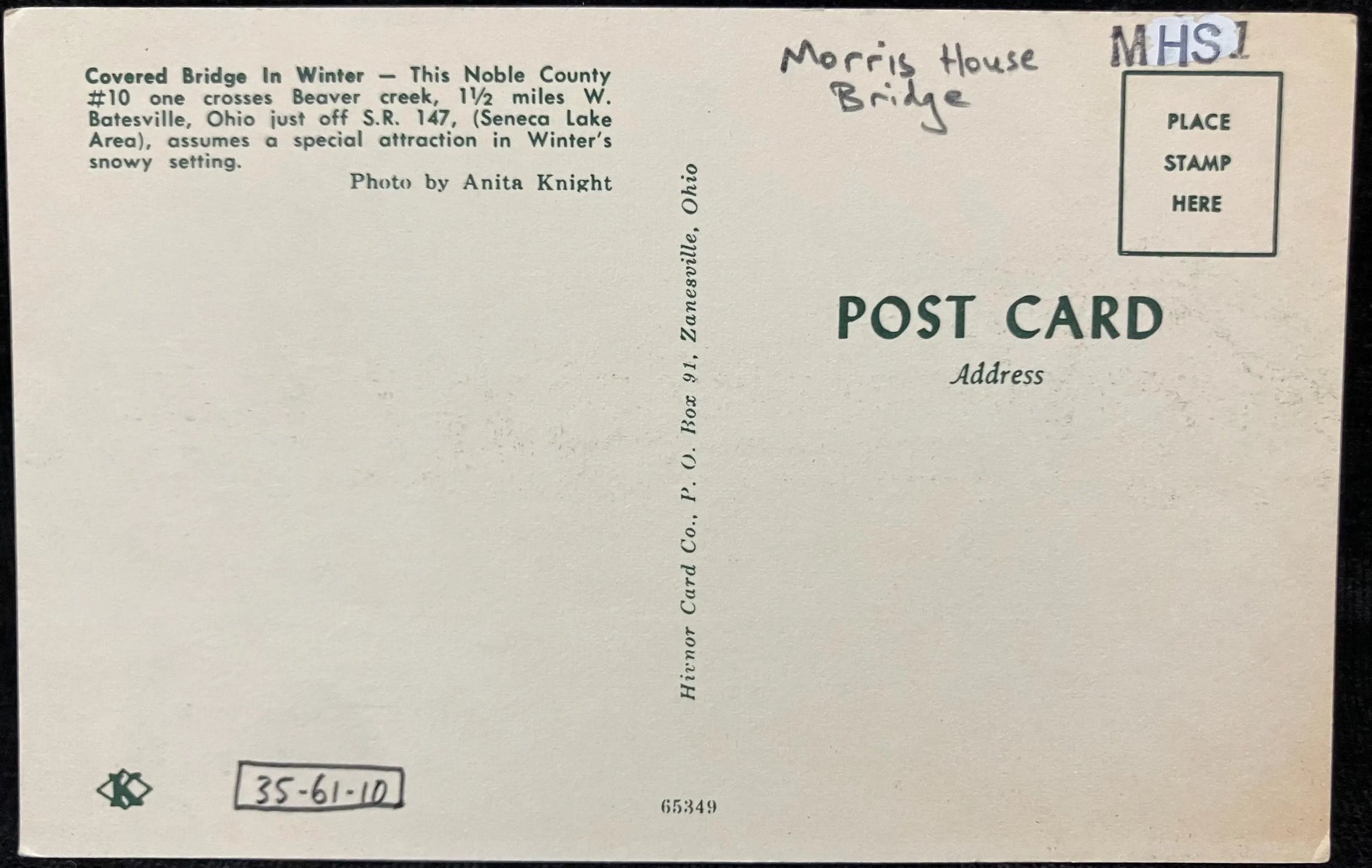 Back: Covered Bridge in Winter - This Noble County #10 one crosses Beaver creek, 1 1/2 miles W. Batesville, Ohio just off S. R. 147, (Seneca Lake Area), assumes a special attraction in Winter's snowy setting.