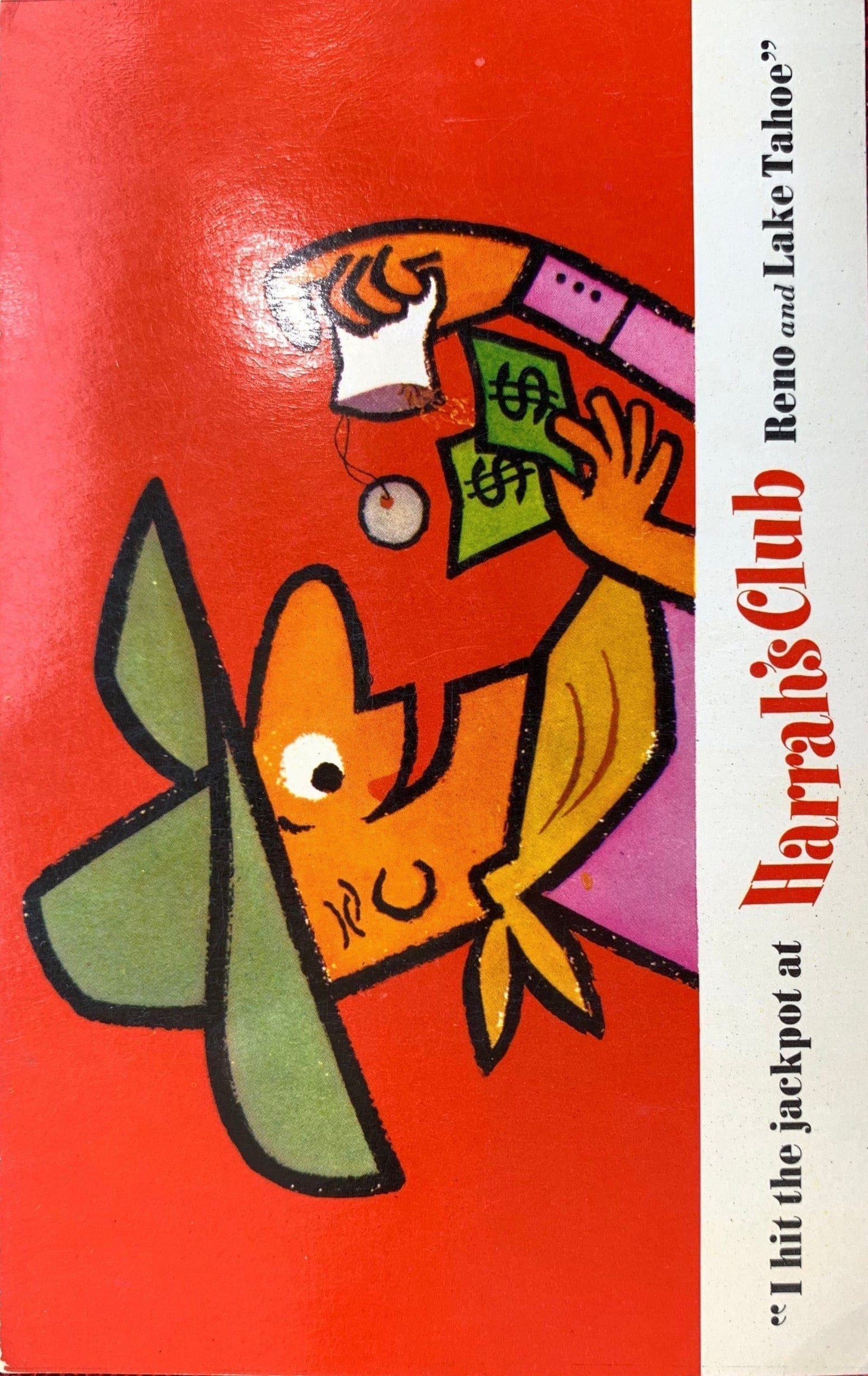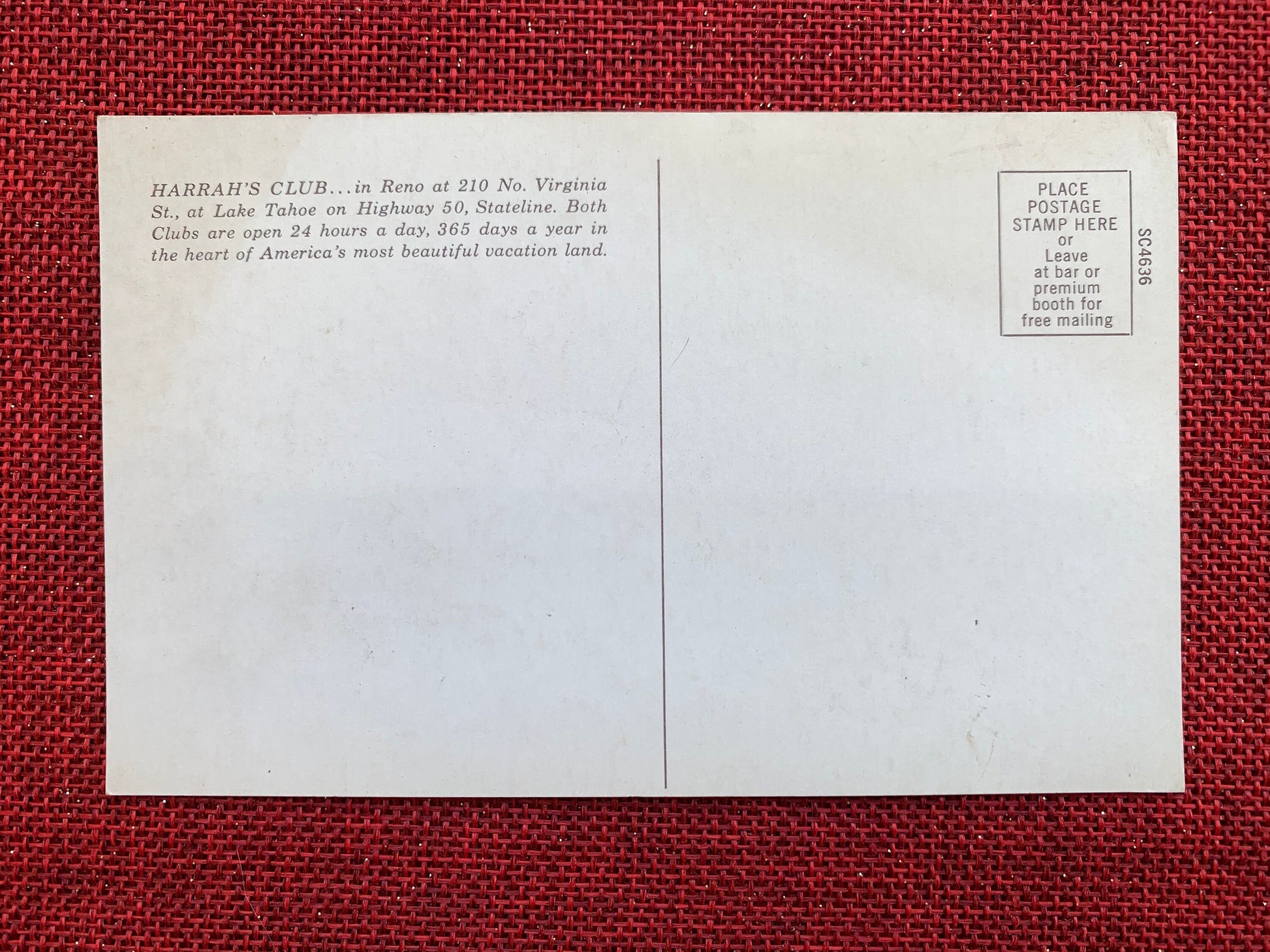 Back Text: "HARRAH'S CLUB . . . in Reno at 210 No. Virginia St., at Lake Tahoe on Highway 50, Stateline. Both Clubs are open 24 hours a day, 365 days a year in the heart of America's most beautiful vacation land."
