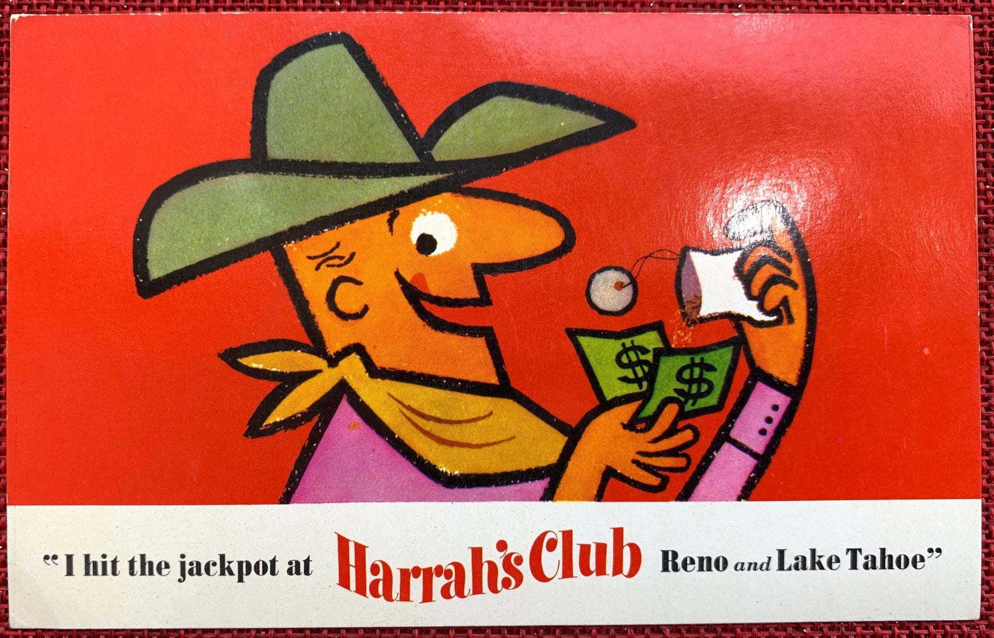 Cowboy I Hit The Jackpot At Harrah's Club Reno and Lake Tahoe Vintage Postcard