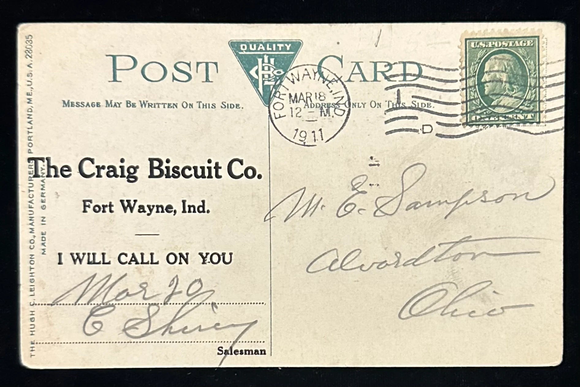 Mailed: Posted on March 18th, 1911 from Fort Wayne, Indiana with a green 1 cent Ben Franklin stamp