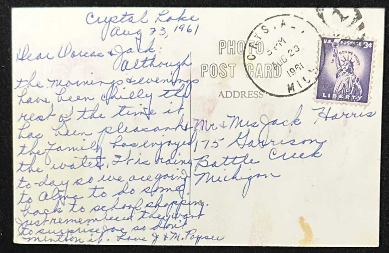 Mailed: posted on August 23, 1961, from Crystal, Michigan with a lilac 3 cent Lady Liberty stamp