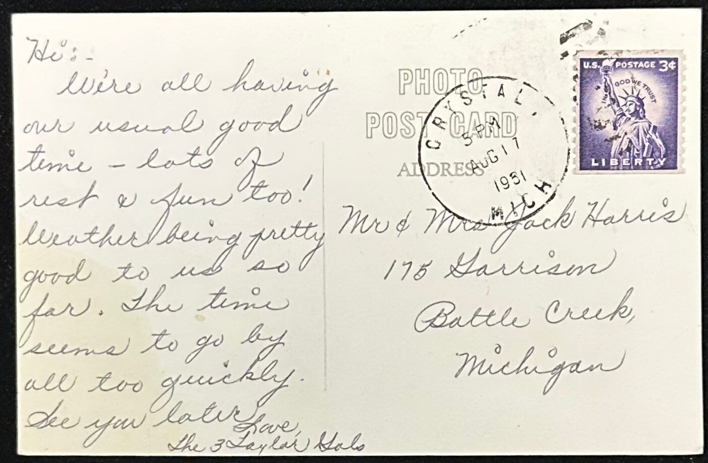 Mailed: Posted on August 17, 1951 from Crystal, Michigan with a 3 cent Lilac Lady Liberty stamp
