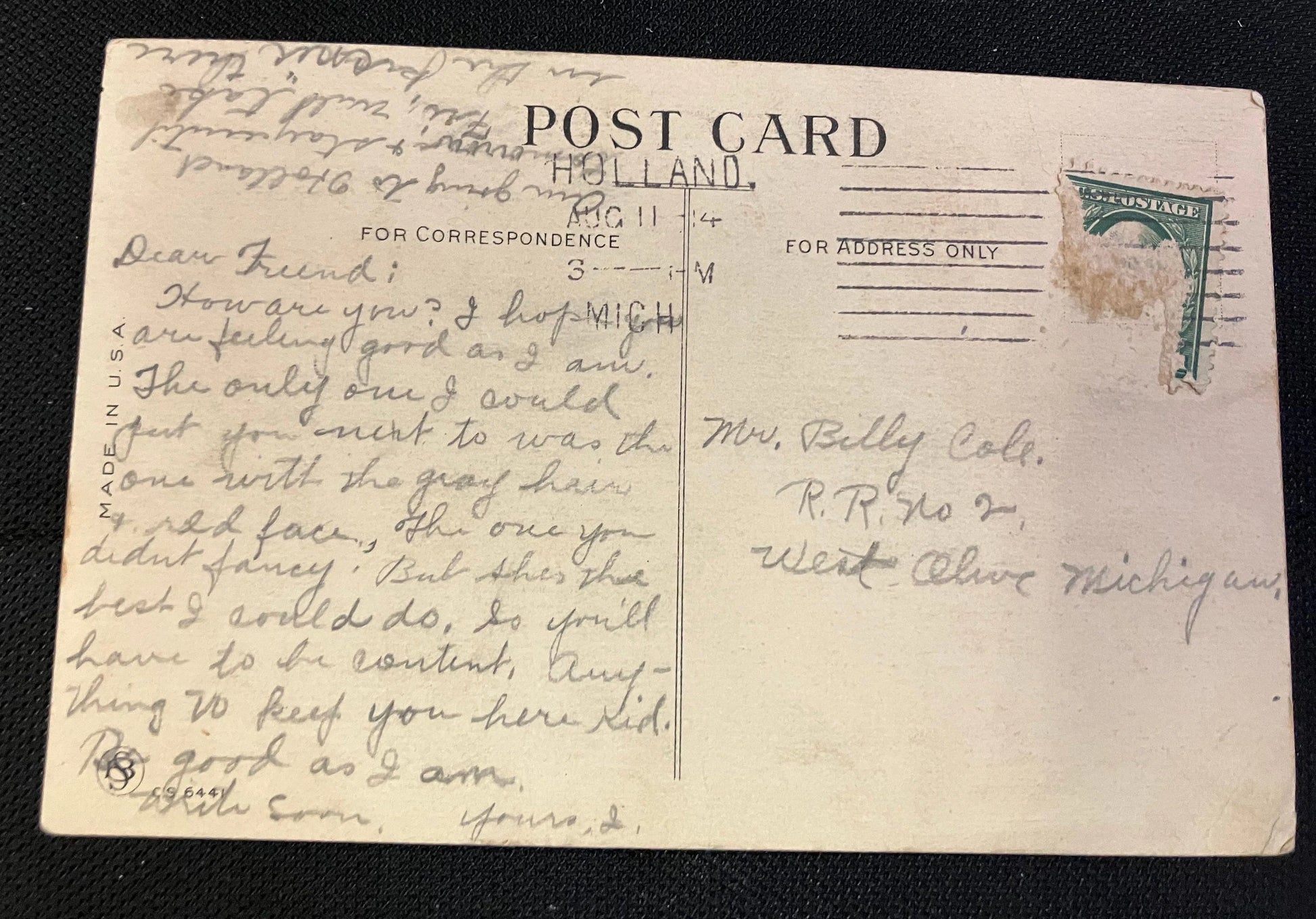 Mailed: August 11 1934, Holland, MI. with a torn green 1-cent George Washington stamp and original letter
