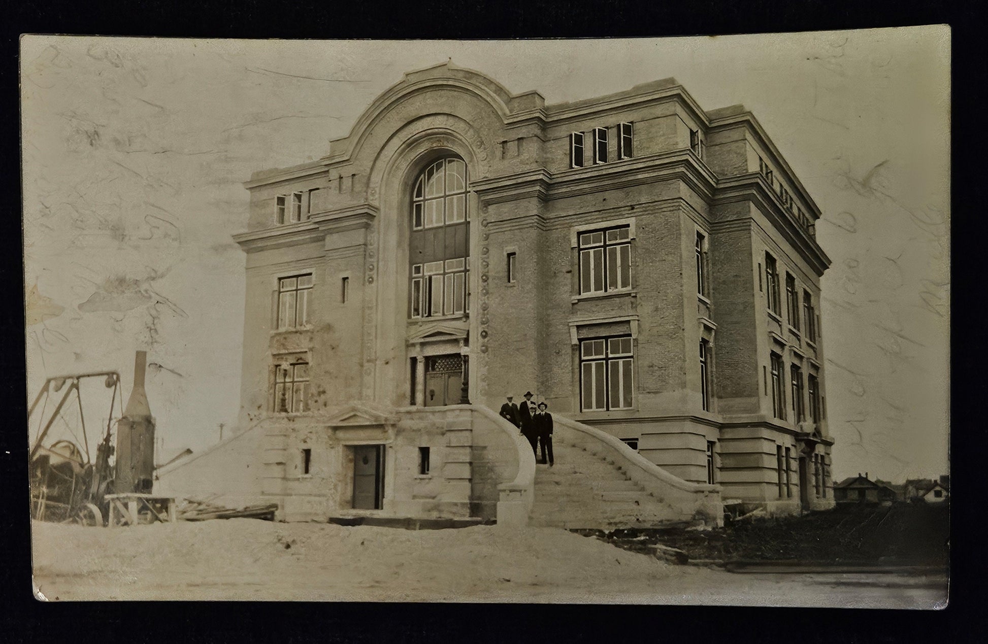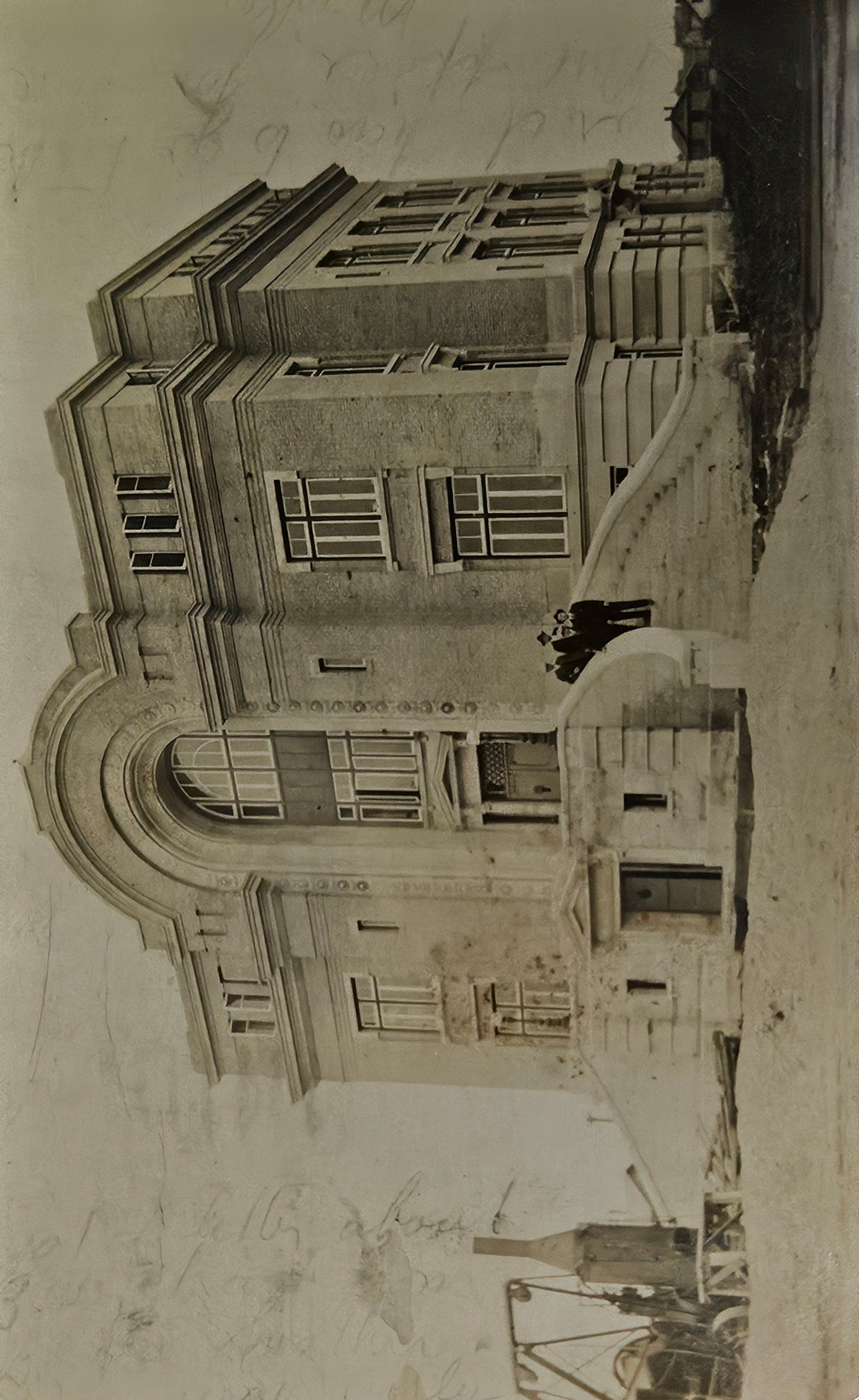 Sepia colored photo - Appears, possibly, to be a new school Building - but could be an apartment Building, there are small homes in the back ground. looks like a penciled note was once on the front.