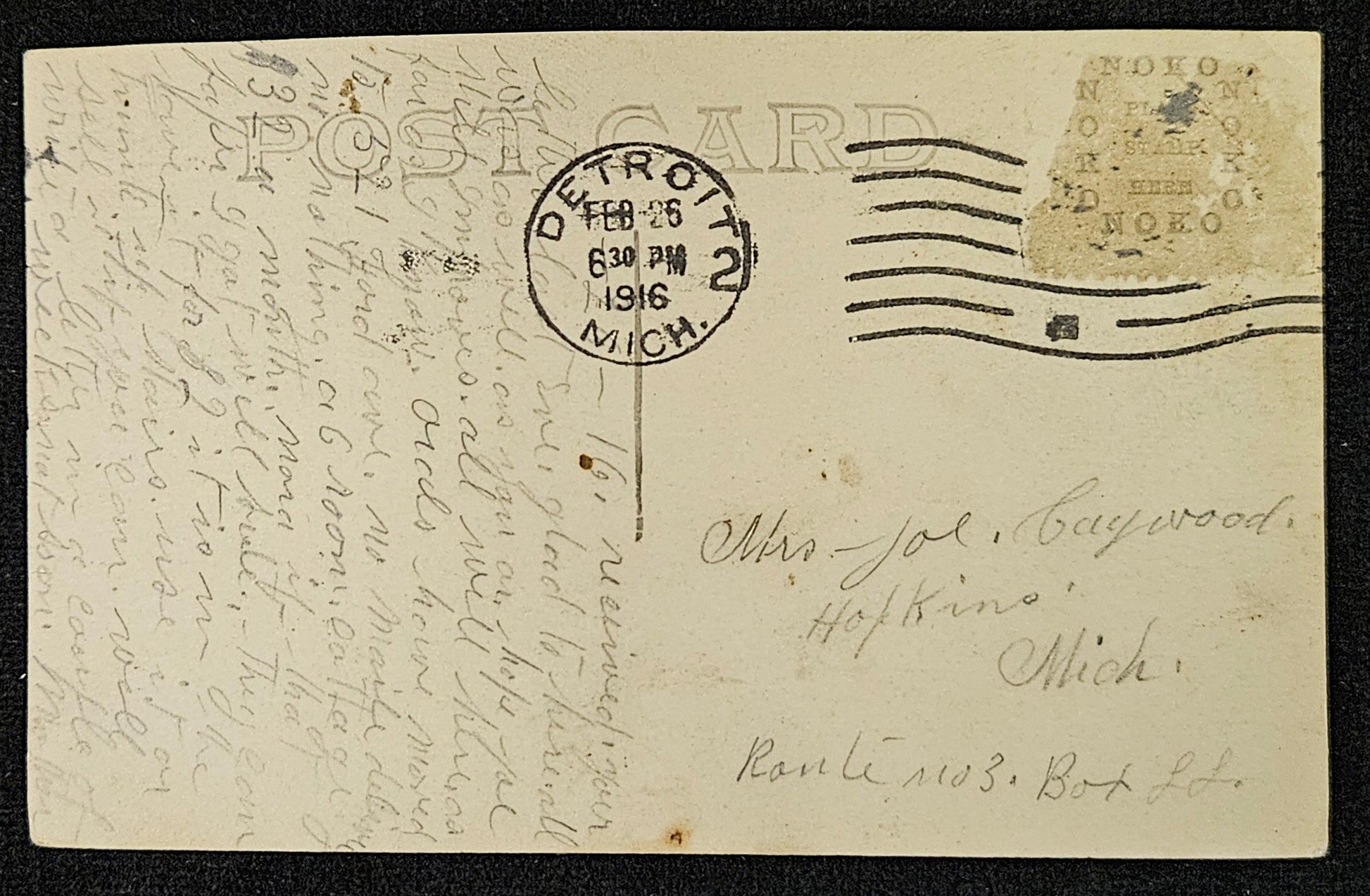 The card was mailed from Detroit in 1916, the stamp was removed. The copy was in pencil and is hard to read.