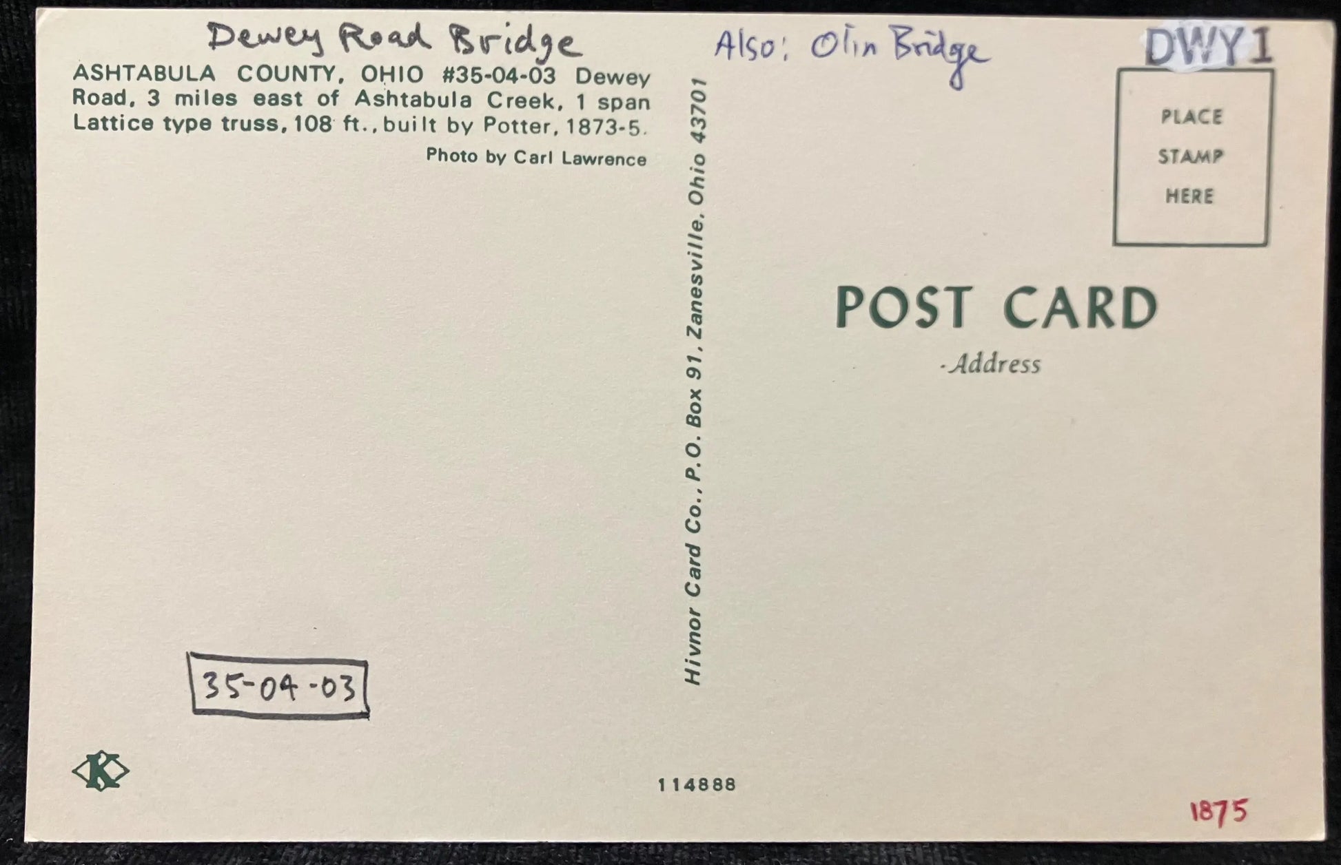 Back: ASHTABULA COUNTY, OHIO #35-04-03 Dewey Road, 3 mile eat of Ashtabula Creek, 1 span Lattice type truss, 108 ft., built by Potter, 1873-5.