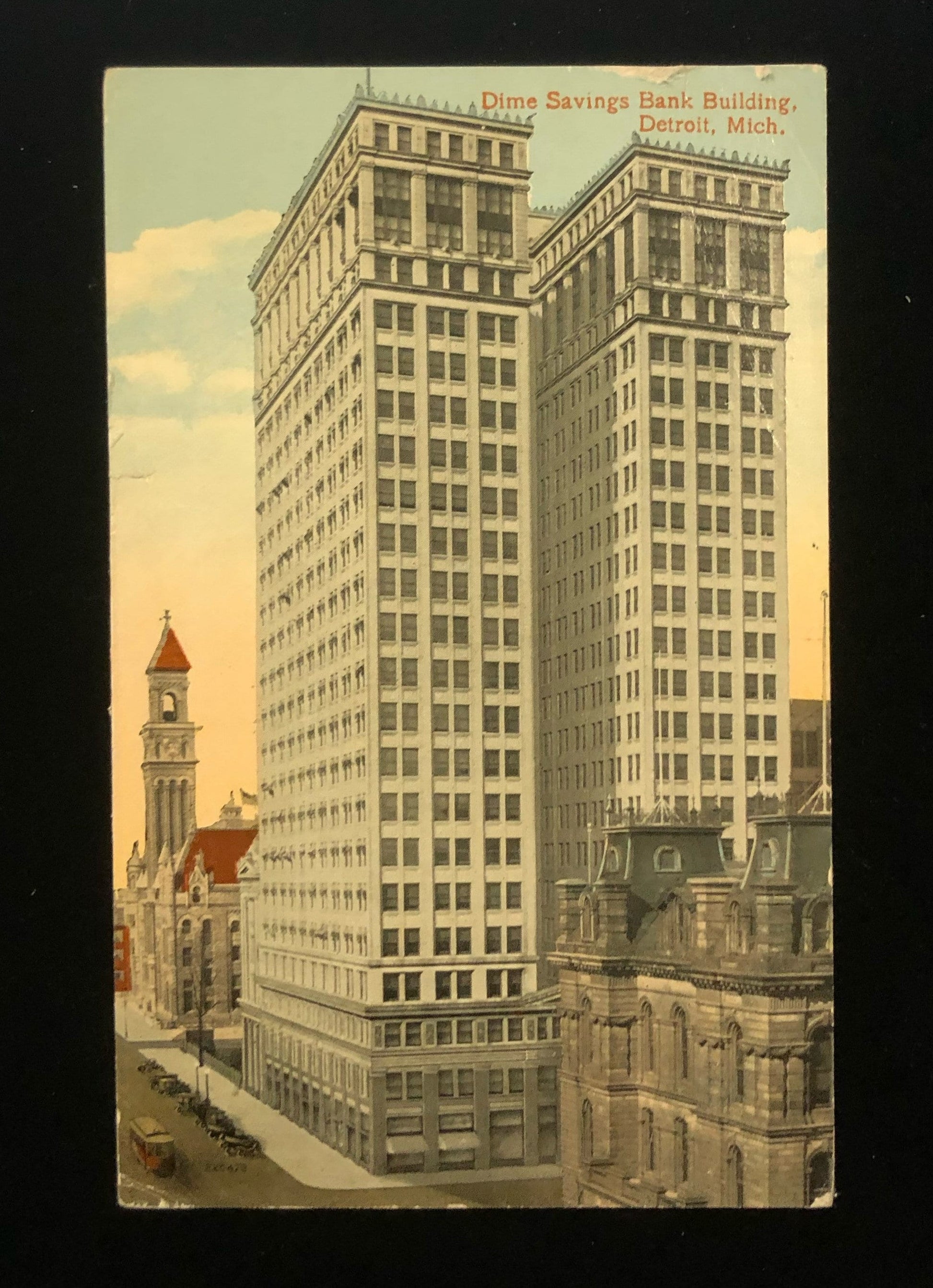 Back copy: Dime Savings Bank Building. This is the largest office building in the city, located on Fort and Griswold Streets. Contains over 1,000 offices.