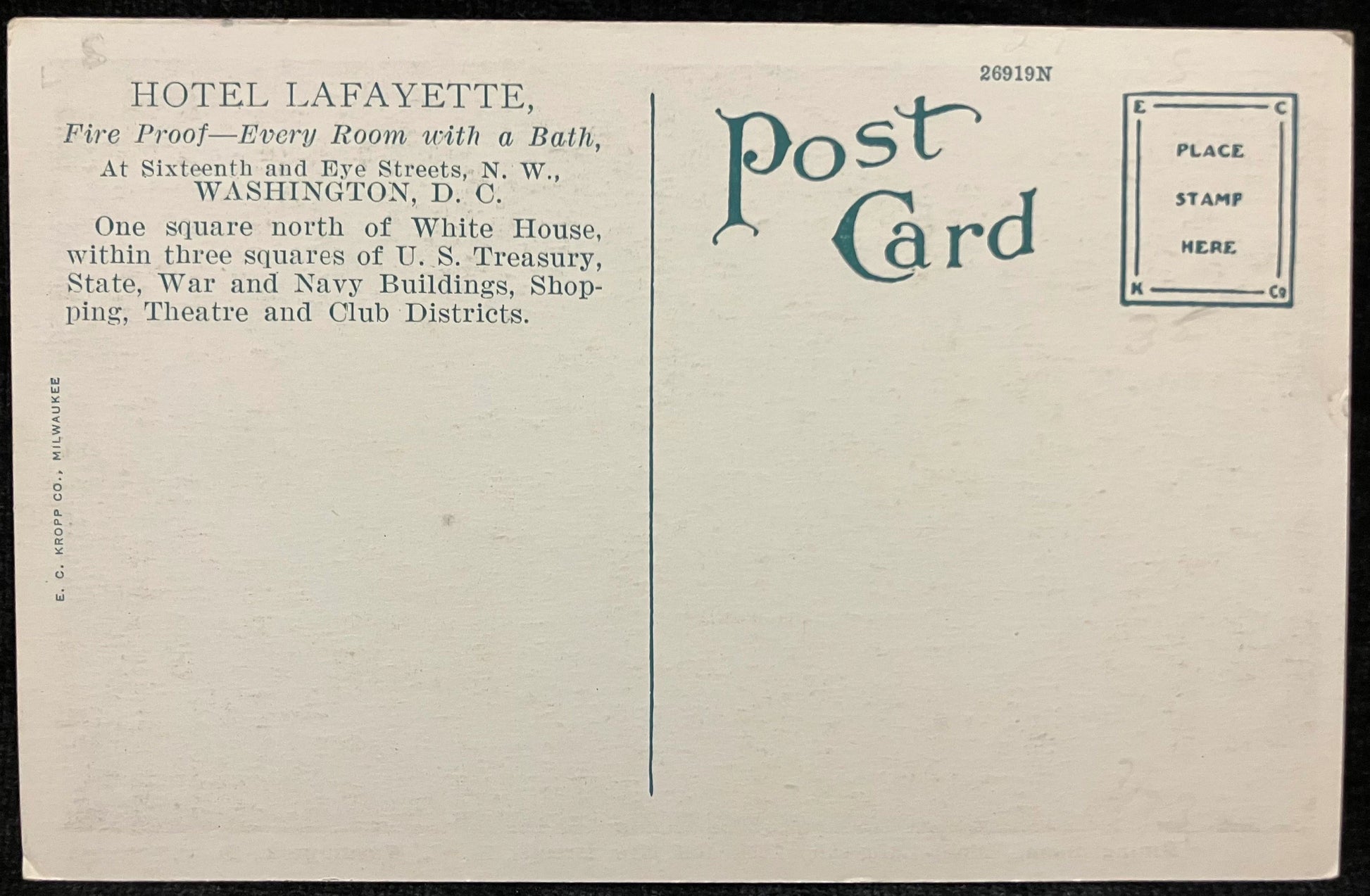 Back: HOTEL LAFAYETTE, Fire Proof - Every Room with a Bath, At Sixteen and Eye Streets, N. W., WASHINGTON, D. C. One square north of White House, within three squares of U. S. Treasury, State, War and Navy Buildings Shopping, Theater and Club Districts.