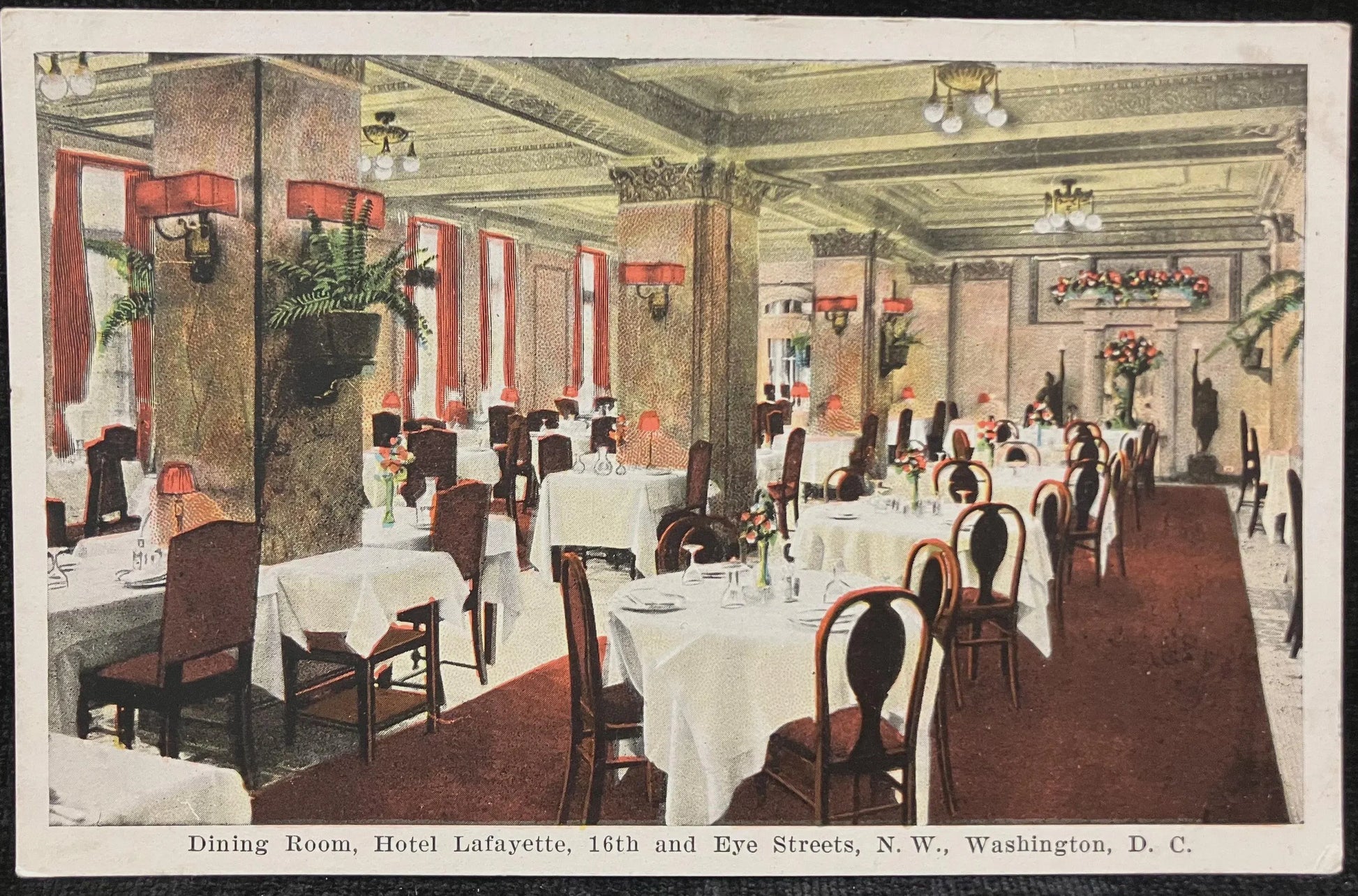 Dining Room, Hotel Lafayette, 16th and Eye Streets, N. W., Washington, DC - Vintage Hotel Postcard