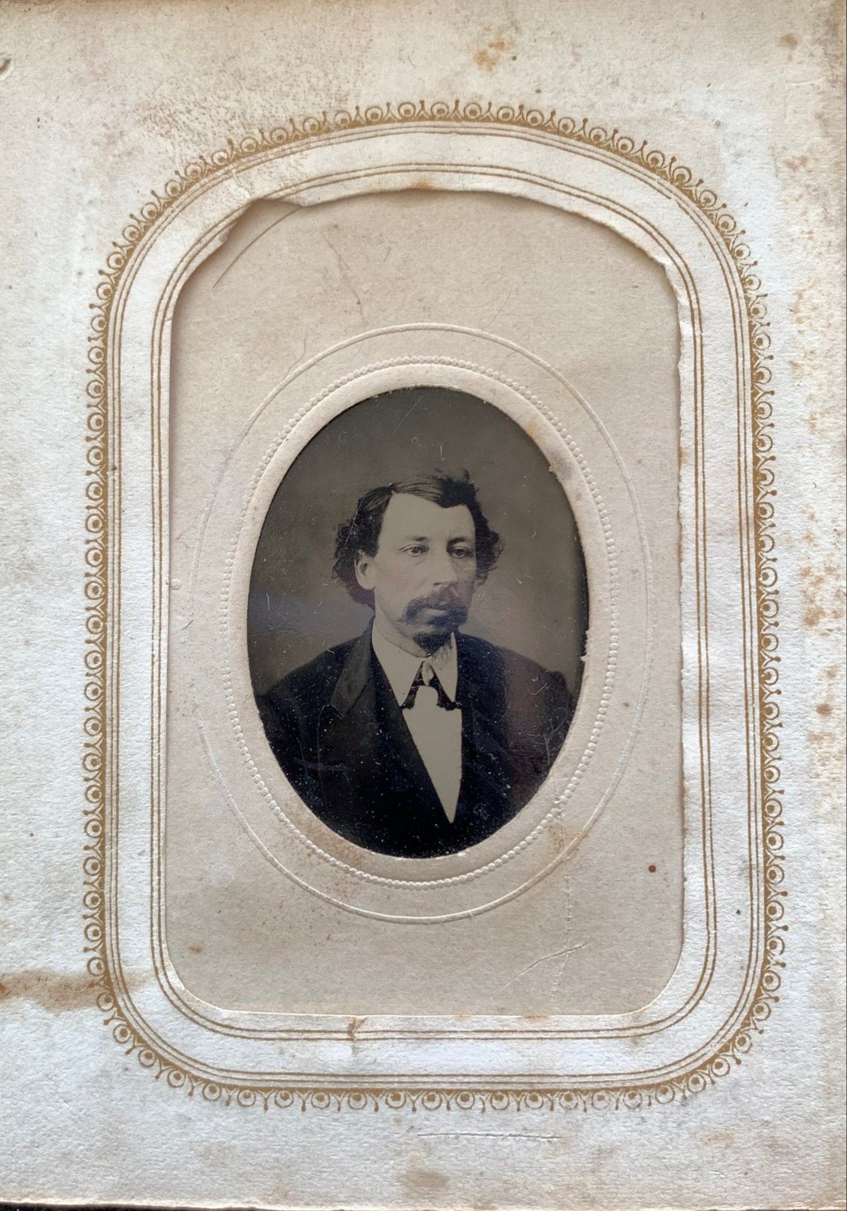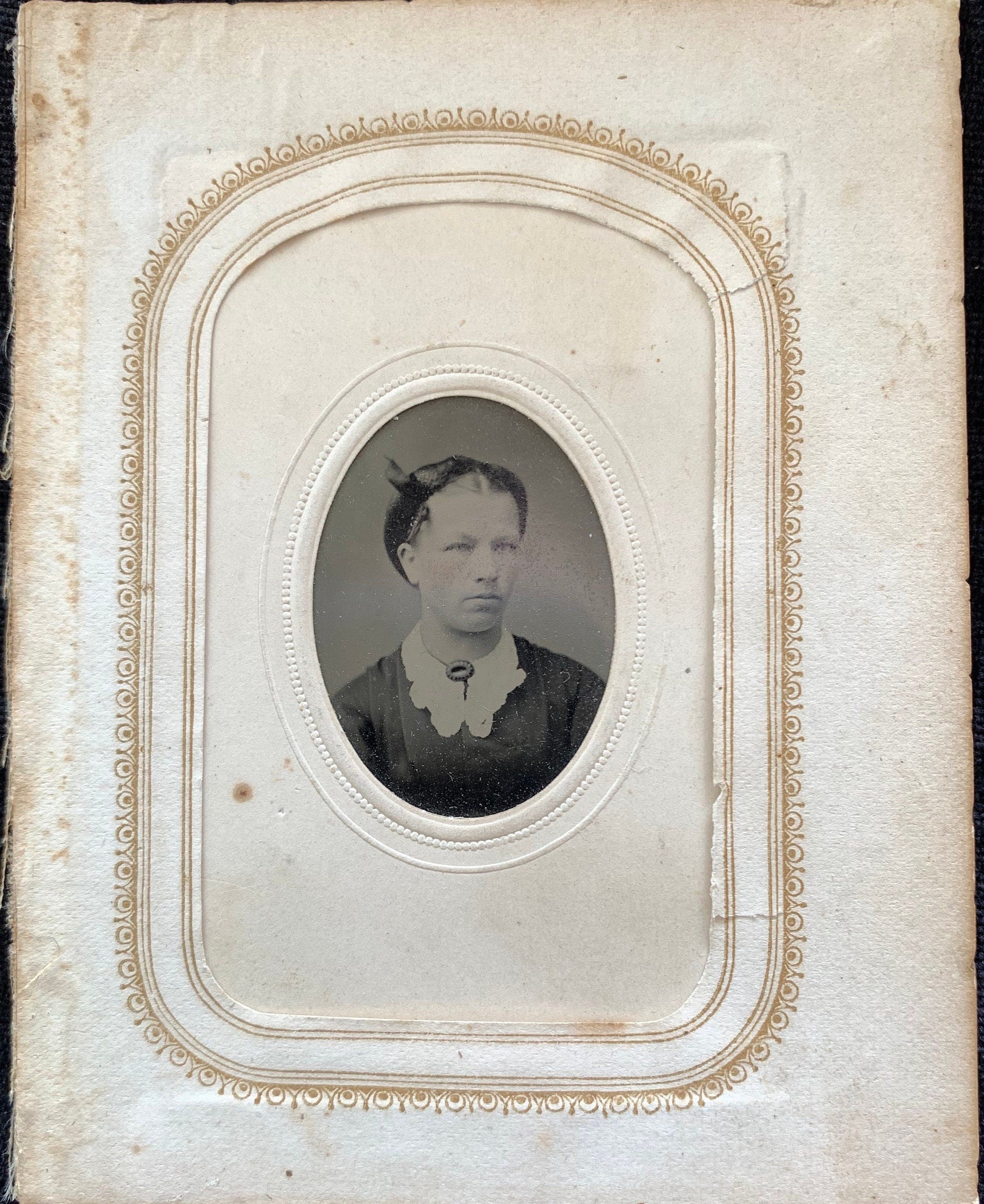 This page was likely bound in a photo album based on the edges. It is double sided with one side featuring a well dressed man while the other features a well dressed woman. Neither person is smiling, as is common in photos from this time. The subject had to sit for an extended period of time while the photo was taken. The photograph was likely taken in the 1860s or 1870s, when tintypes were most popular.
