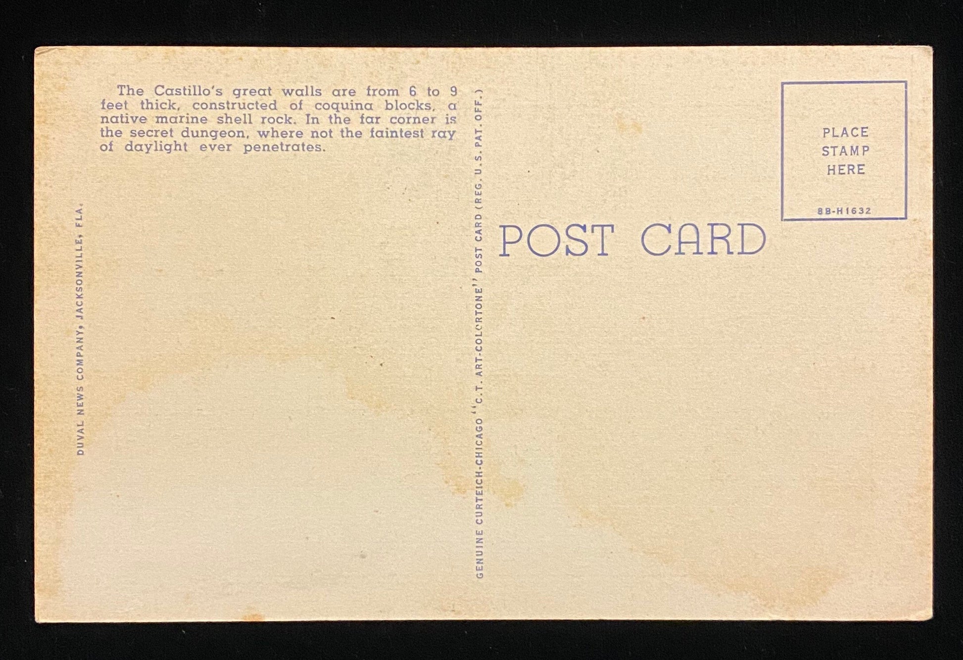 Back Information: "The Castillo's great walls are from 6 to 9 feet thick, constructed of coquina blocks, a native marine shell rock. In the far corner is the secret dungeon, where not the faintest ray of daylight ever penetrates."