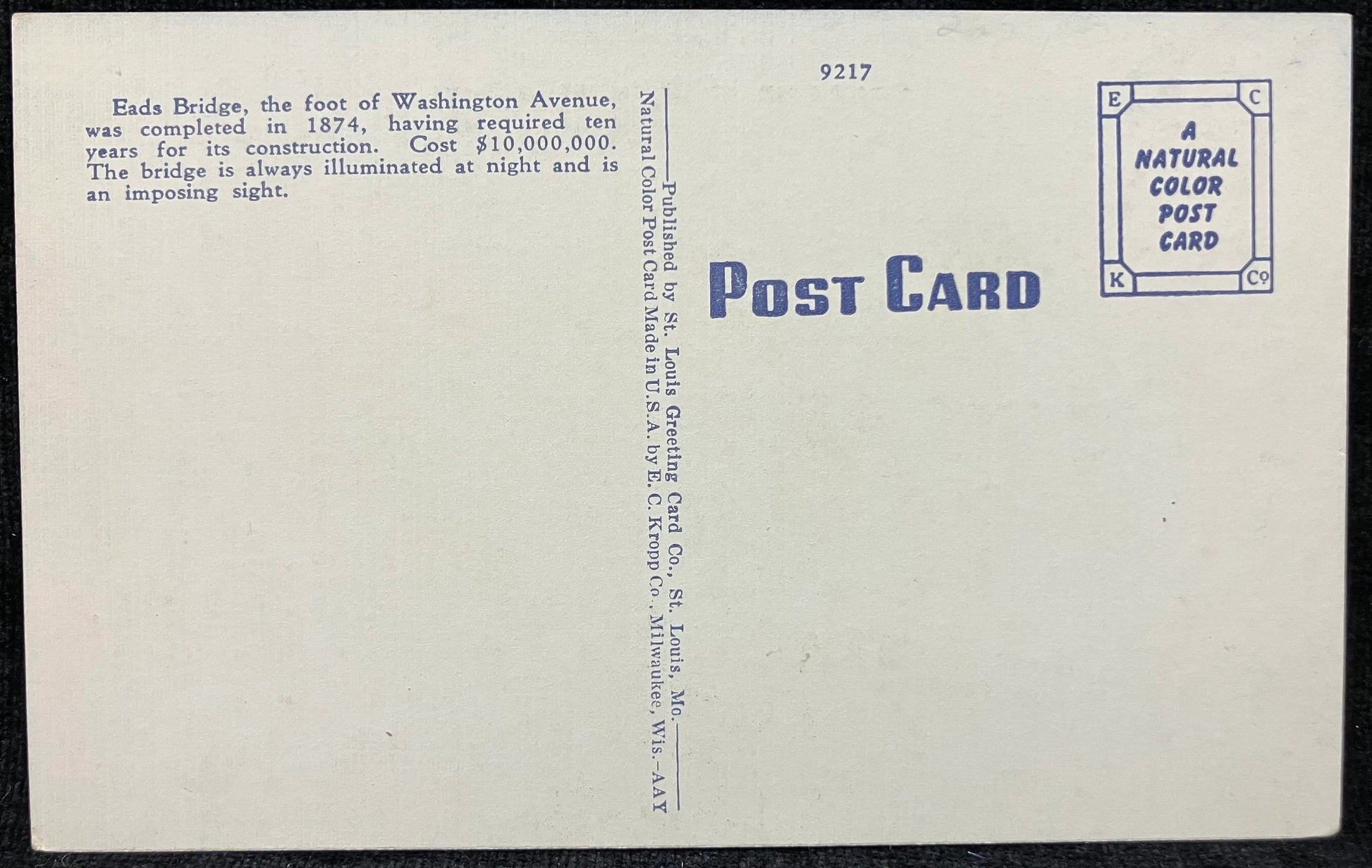 Back: Eads Bridge, the foot of Washington Avenue, was completed in 1874, having required ten years for its construction. Cost $10,000,000. The bridge is always illuminated at night and is an imposing sight.