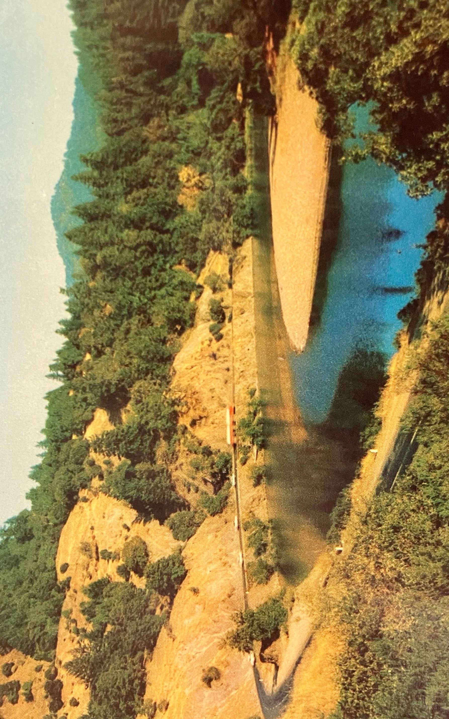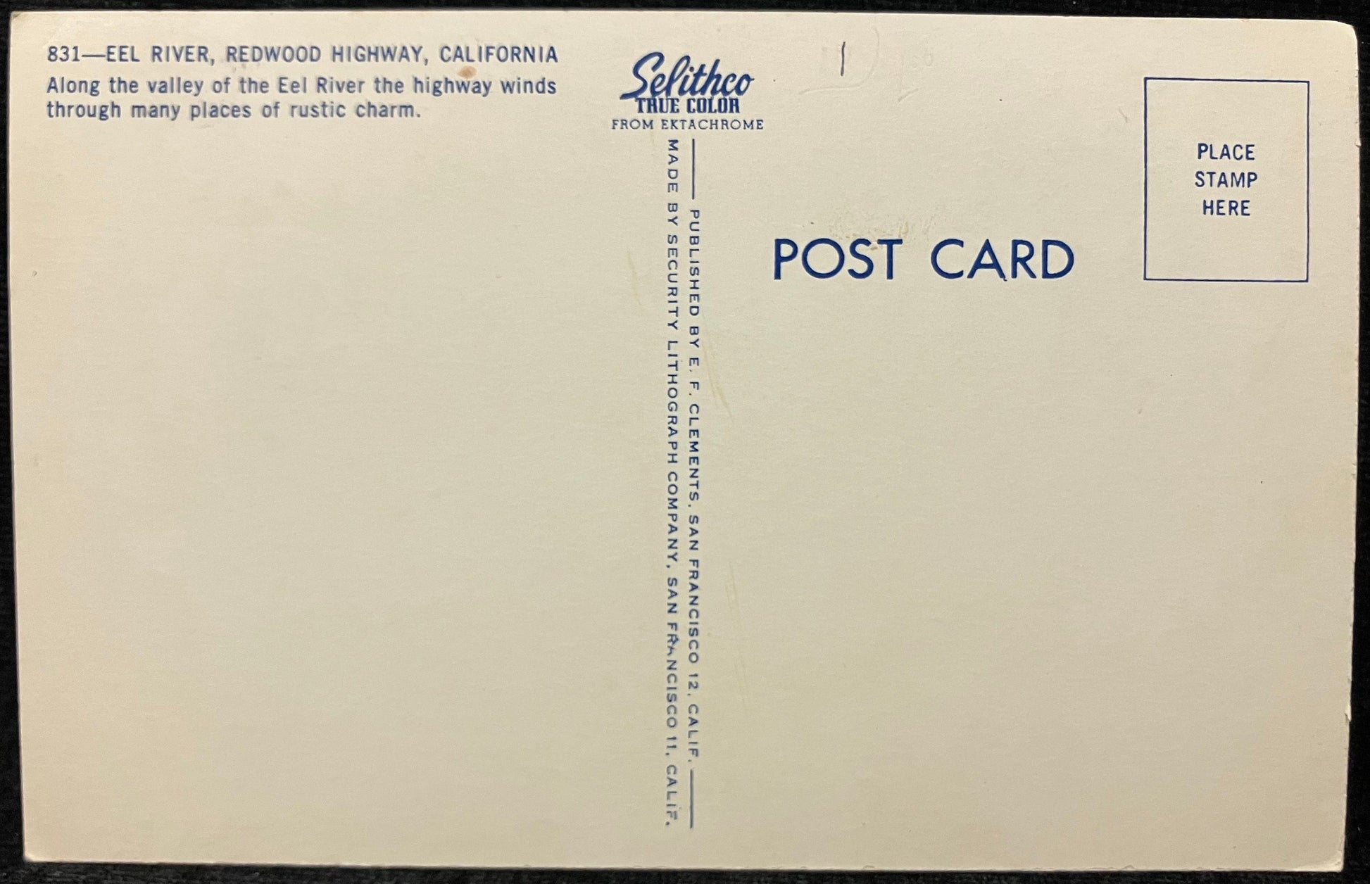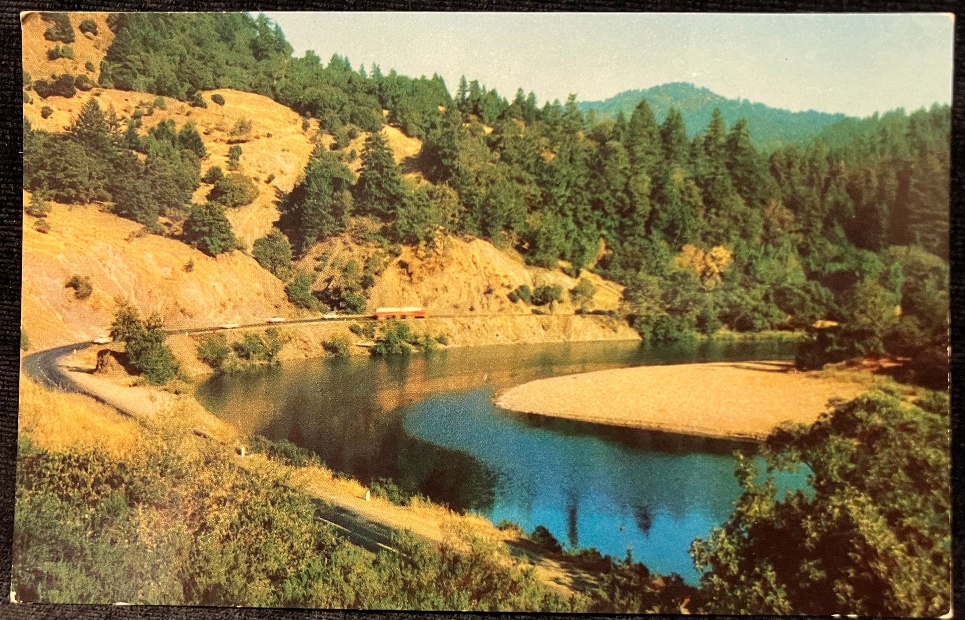On back: Eel River, Redwood Highway, California. Along the valley of the Eel River the highway winds through many places of rustic charm.