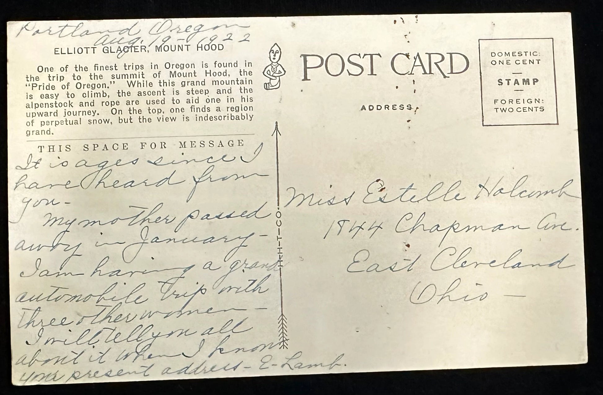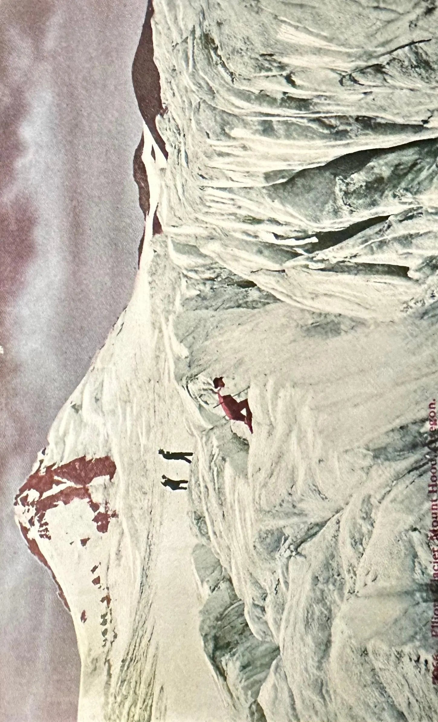 Back Information: Elliott Glacier, Mount Hood: One of the finest trips in Oregon is found in the trip to the summit of Mount Hood, the "Pride of Oregon." While this grand mountain is easy to climb, the ascent is steep and the alpenstock and rope are used to aid one in his upward journey. On the top one finds a region of perpetual snow, but the view is indescribably grand.