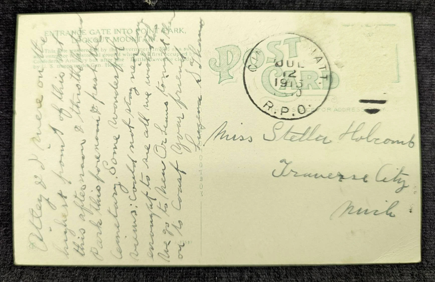 Back: This gate was erected by the Government in 1905 as a suitable entrance to historical ground which we first occupied by Confederate Artillery but after the "Battle above the clouds" by U.S. troops under Gen. Hooker.