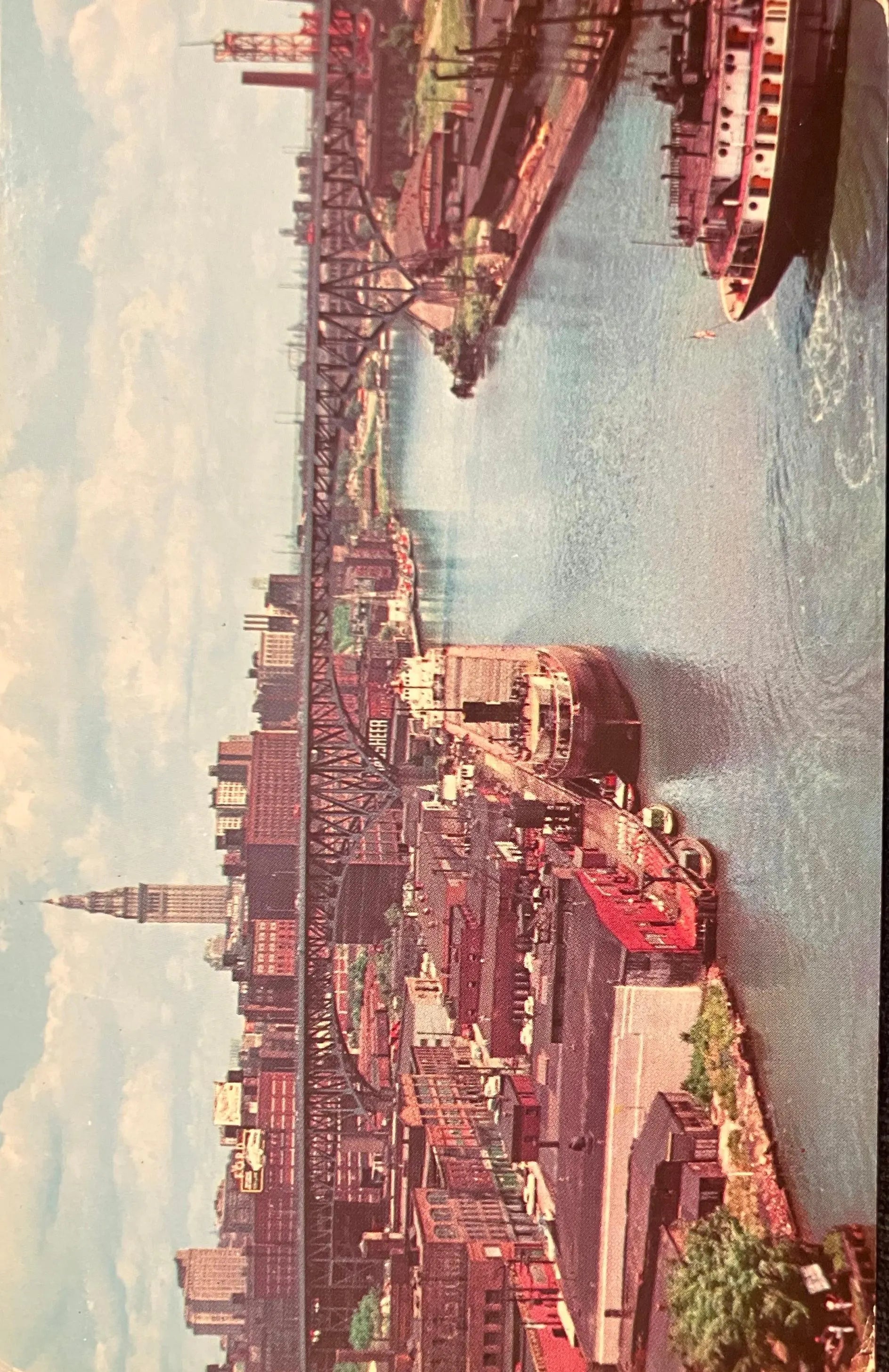Back: ETNRANCE TO CUYAHOGA RIVER CLEVELAND, OHIO. Cleveland’s famed Cuyahoga River, twisting and turning, carries many thousands of lake and ocean, ore and coal freighters each year, to feed the many steel mills in the Cleveland area.