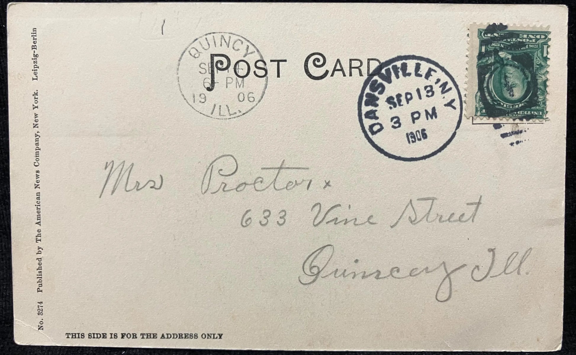 Mailed: Postmark 1906 green one cent upside down placed Benjamin Franklin stamp