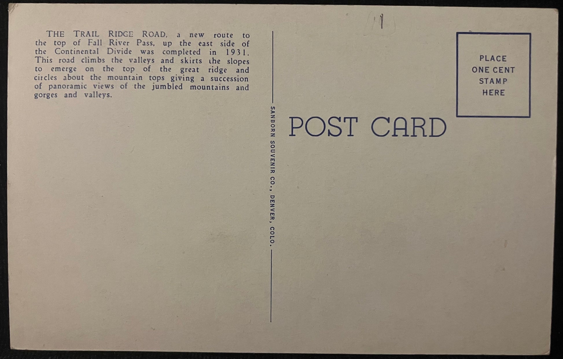 Back: THE TRAIL RIDGE ROAD, a new route to the top of Fall River Pass, up to the east side of the Continental Divide was completed in 1931. This road climbs the valleys and skirts the slopes to emerge on the top of the great ridge and circles about the mountain tops a giving a succession of panoramic views of the jumbled mountains and gorges and valleys.