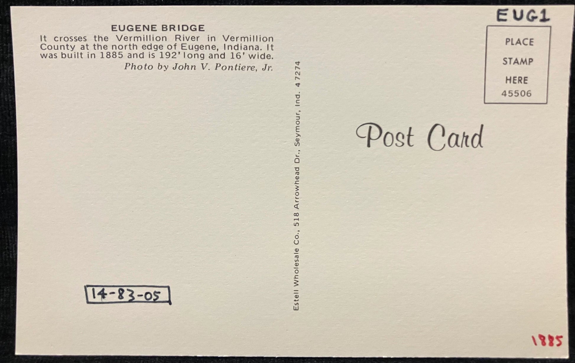 Back: EUGENE BRIDGE It crosses the Vermillion RIver in Vermillion County at the north edge of Eugene, Indiana. It was built in 1885 and is 192’ long and 16’ wide.