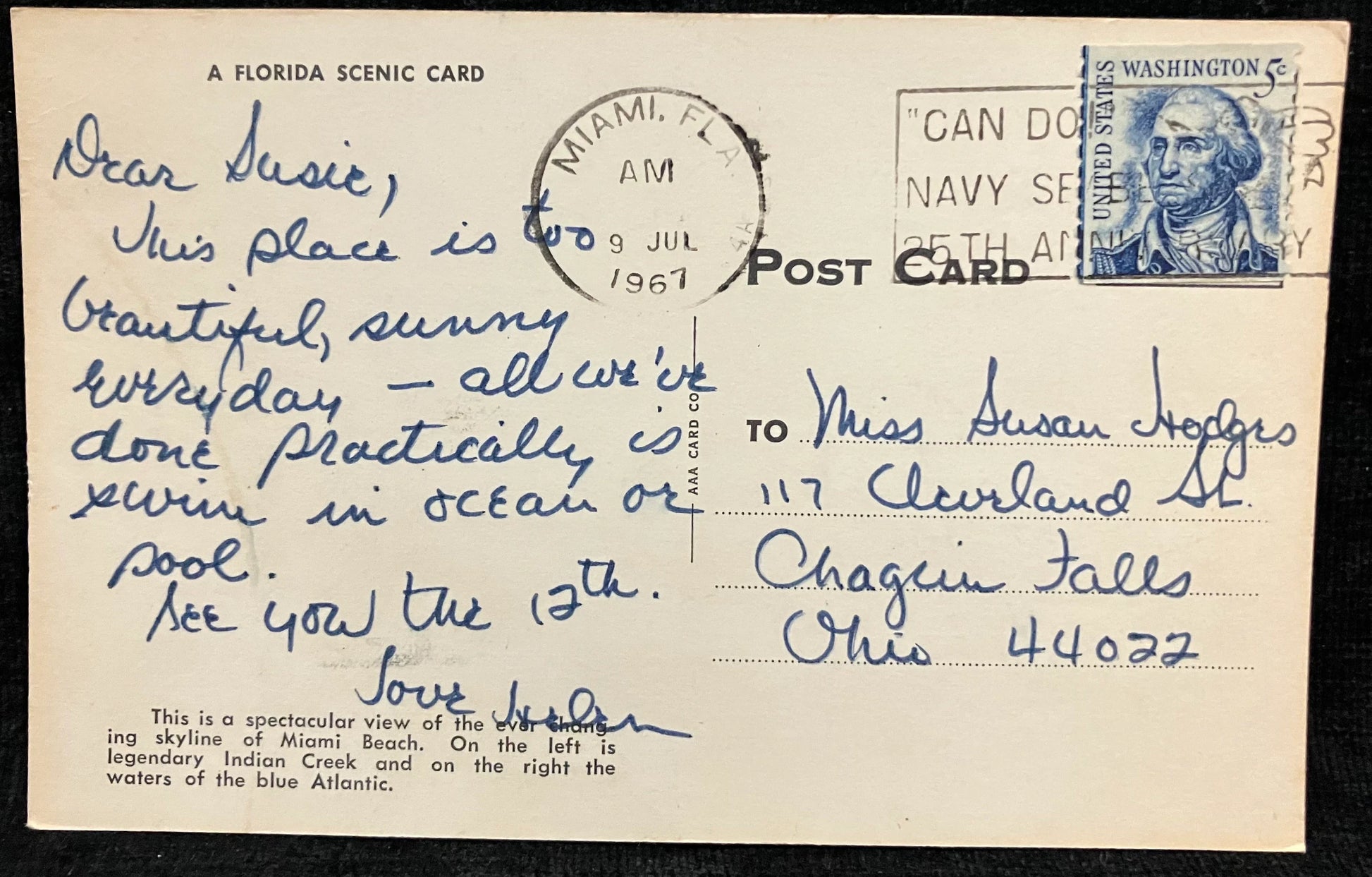 Mailed: Postmark on Jul. 9, 1967 from Miami, Fla. with a blue five cent George Washington stamp