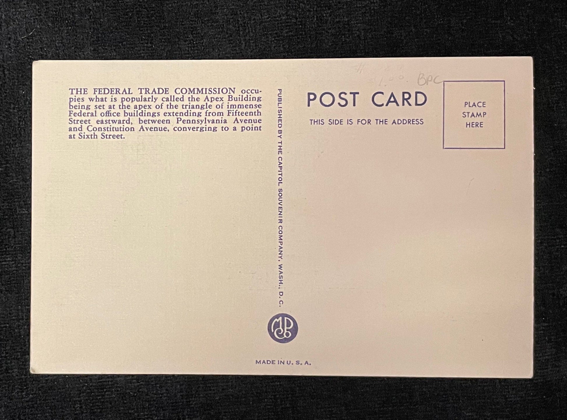 Back: "The Federal Trade Commission occupies what is popularly called the Apex Building being set at the apex of the triangle of immense Federal office buildings extending from Fifteenth Street eastward, between Pennsylvania Avenue and Constitution Avenue, converging to a point at Sixth Street."