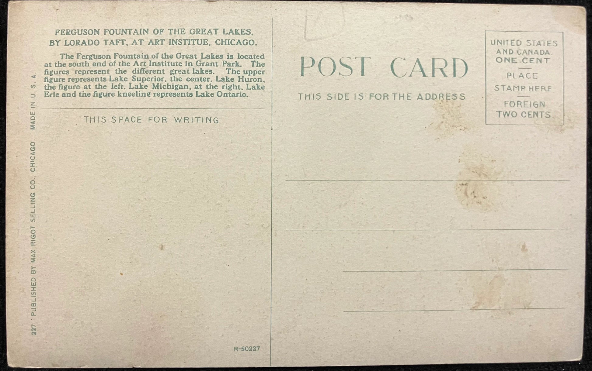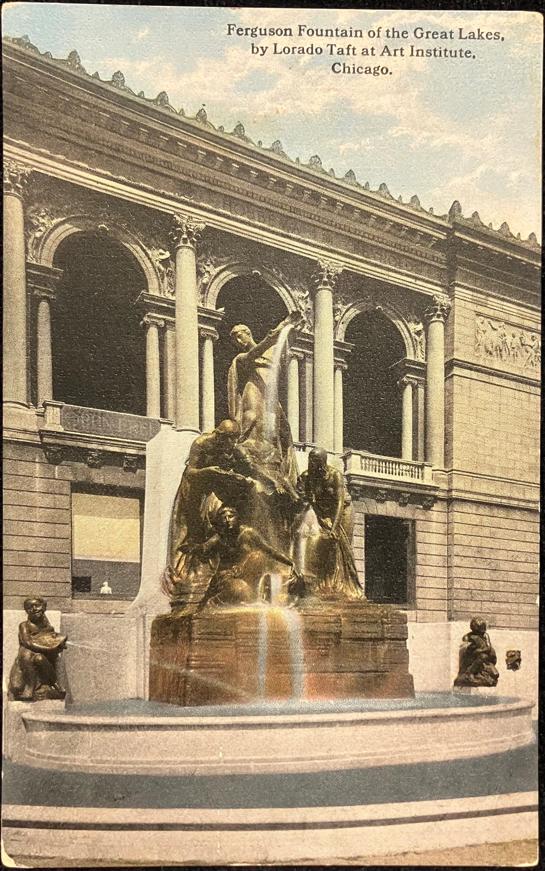 On front: Ferguson Fountain of the Great Lakes, by Lorado Taft at Art Institute, Chicago.