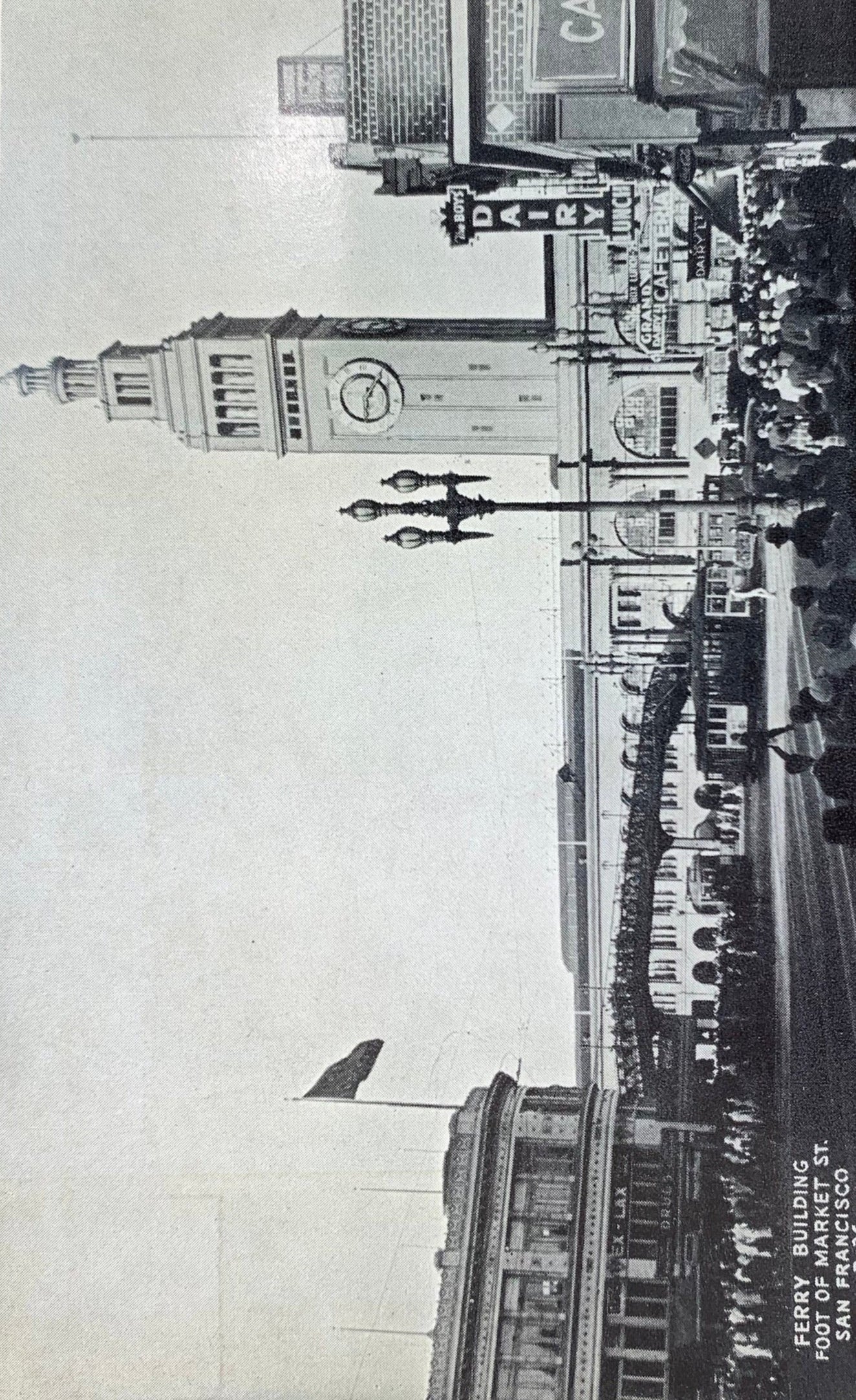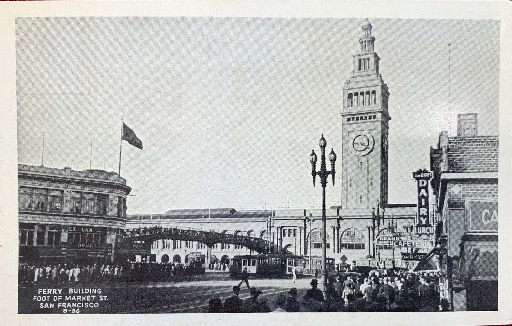 This postcard features a photograph of the Ferry Building at the foot of Market Street in San Francisco, California.