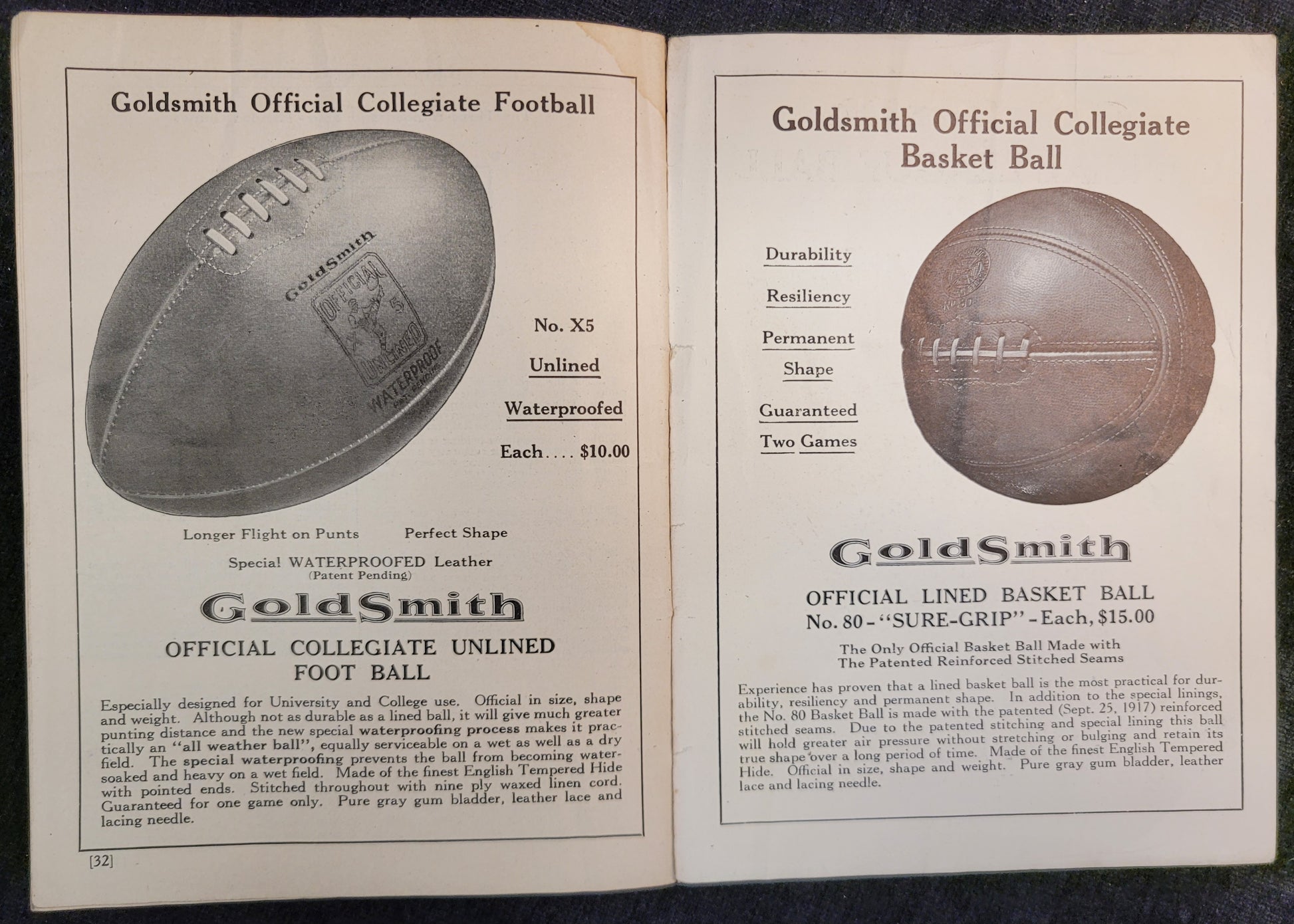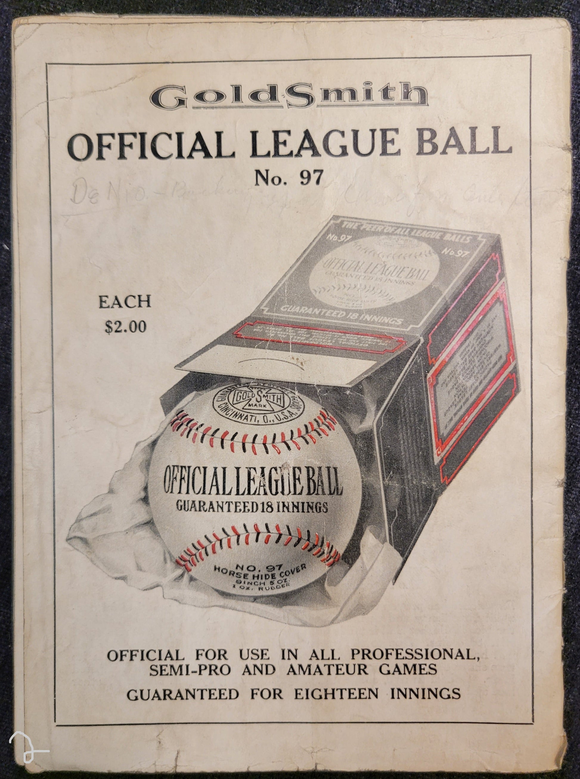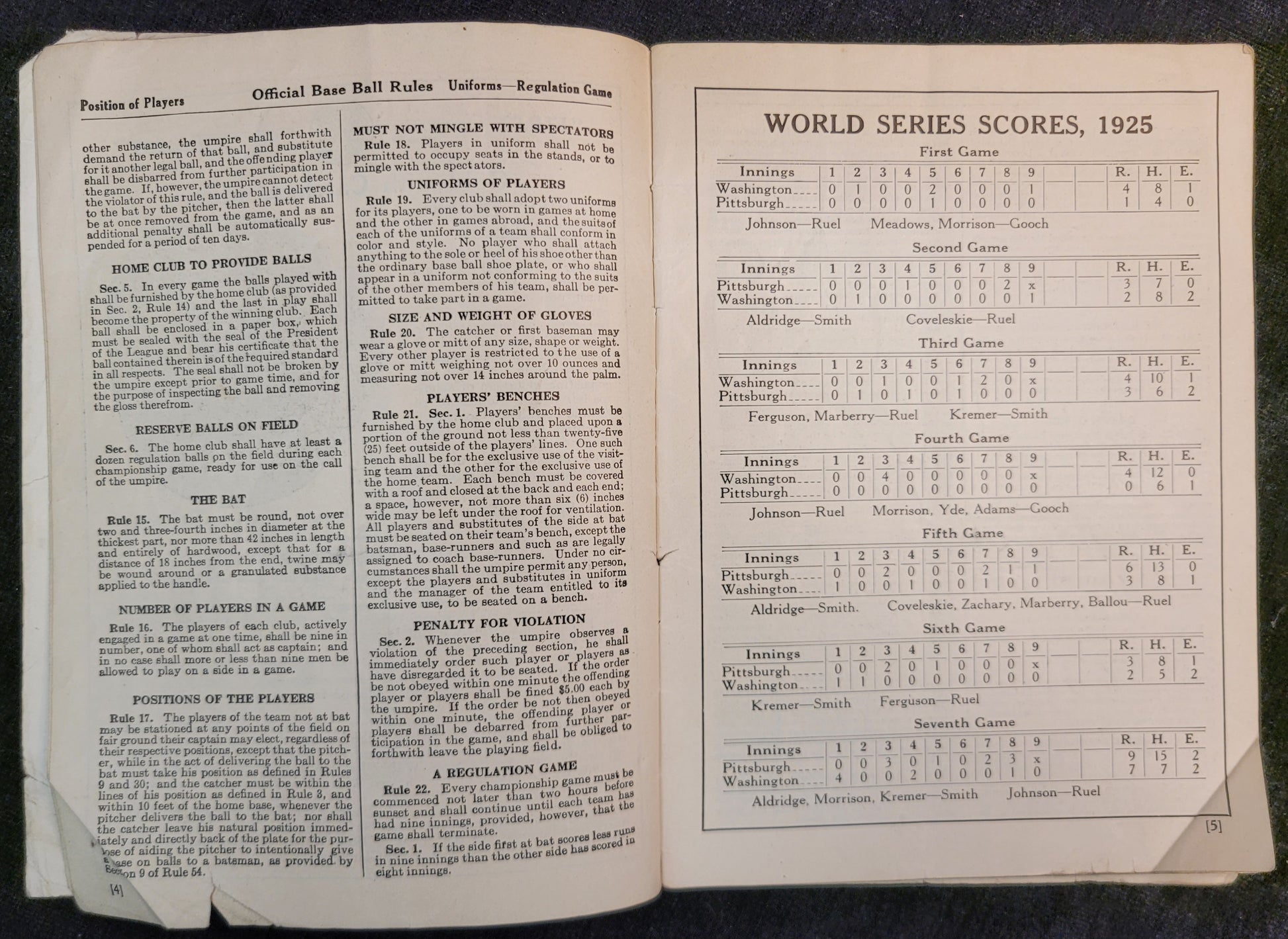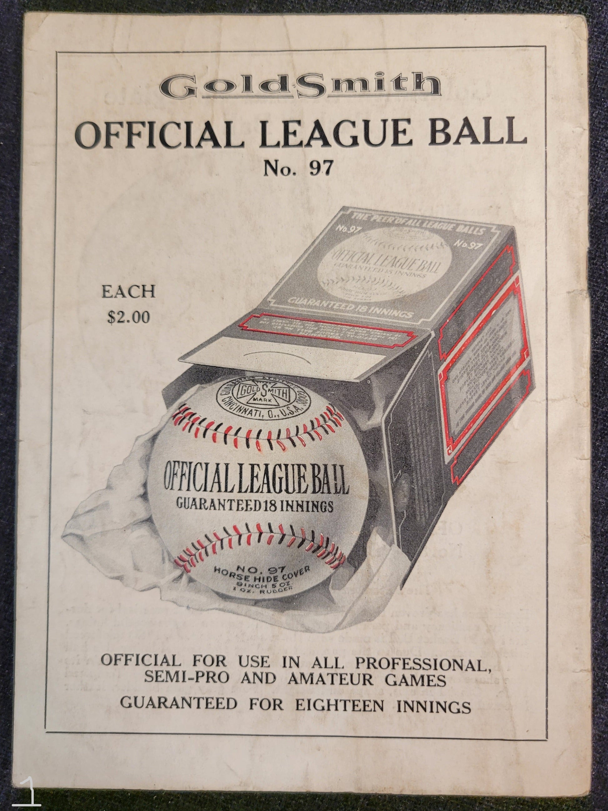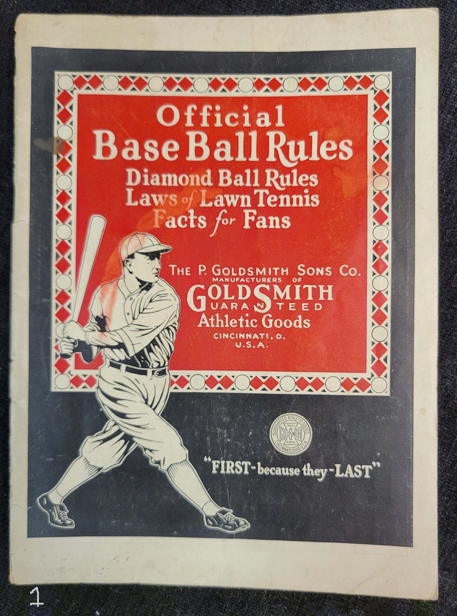 This 1926 edition of Goldsmith's Baseball Rules is in very good condition. There is mild staining on both the front and back cover of each booklet, but otherwise show little signs of use or fraying. The Goldsmith logo on the front cover was used by the company between the years of 1926 and 1933.
