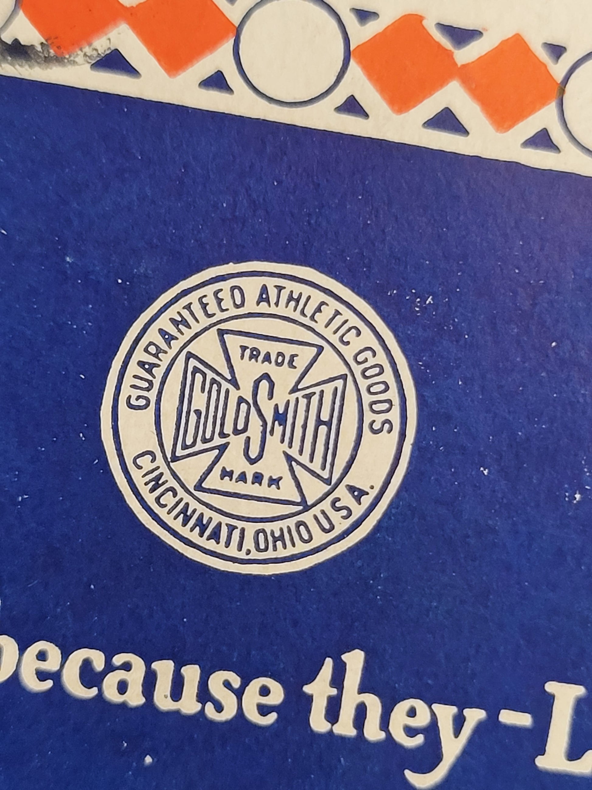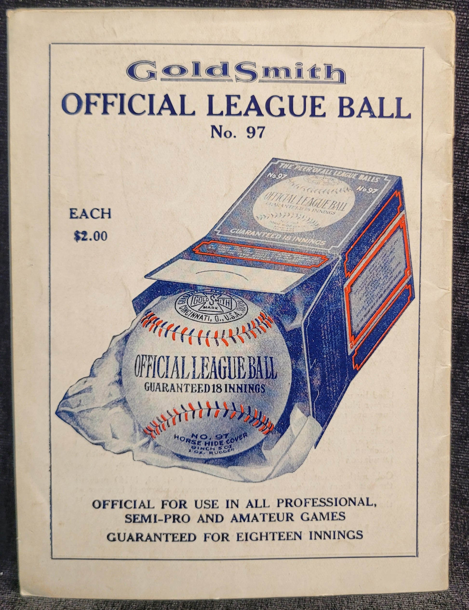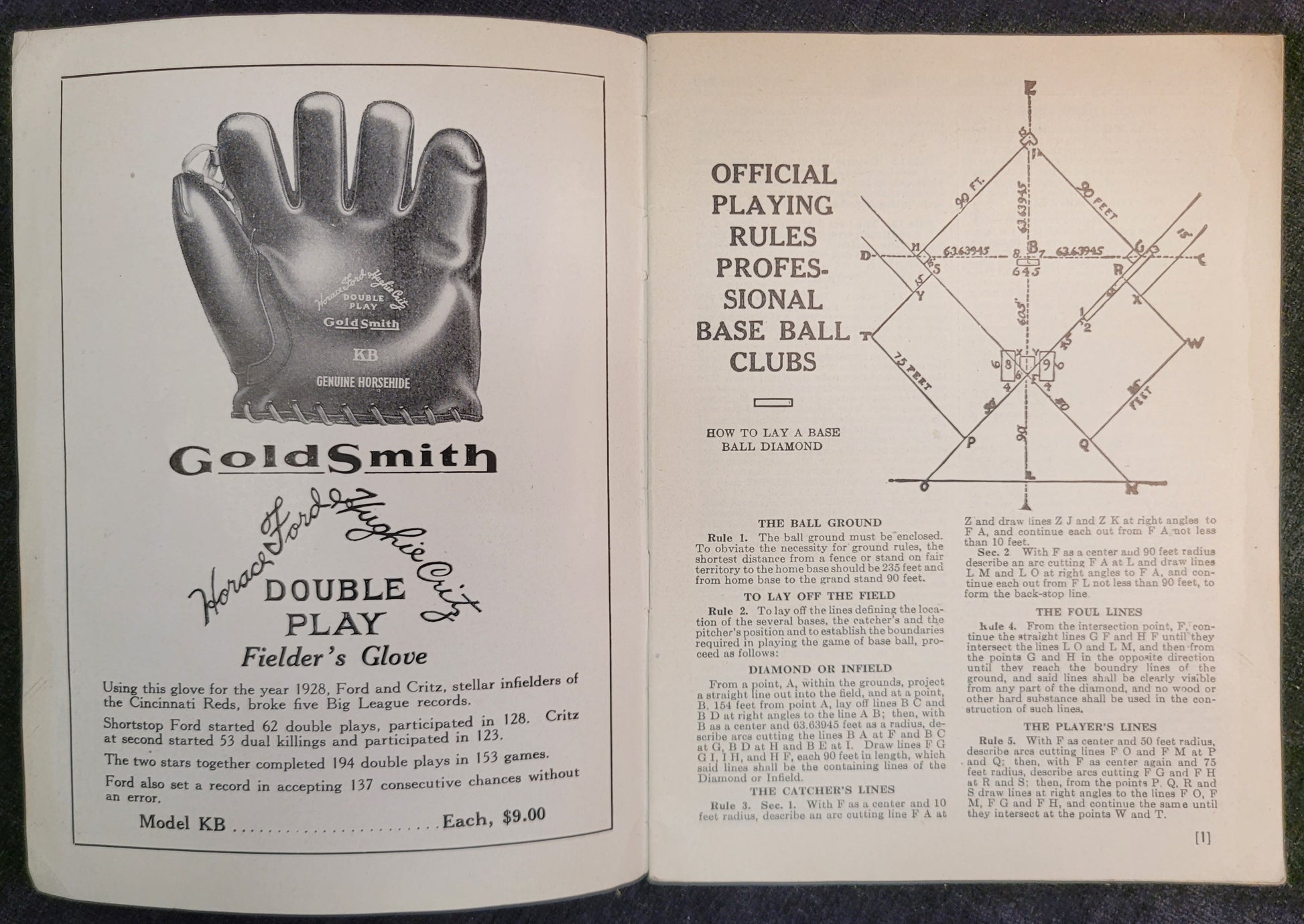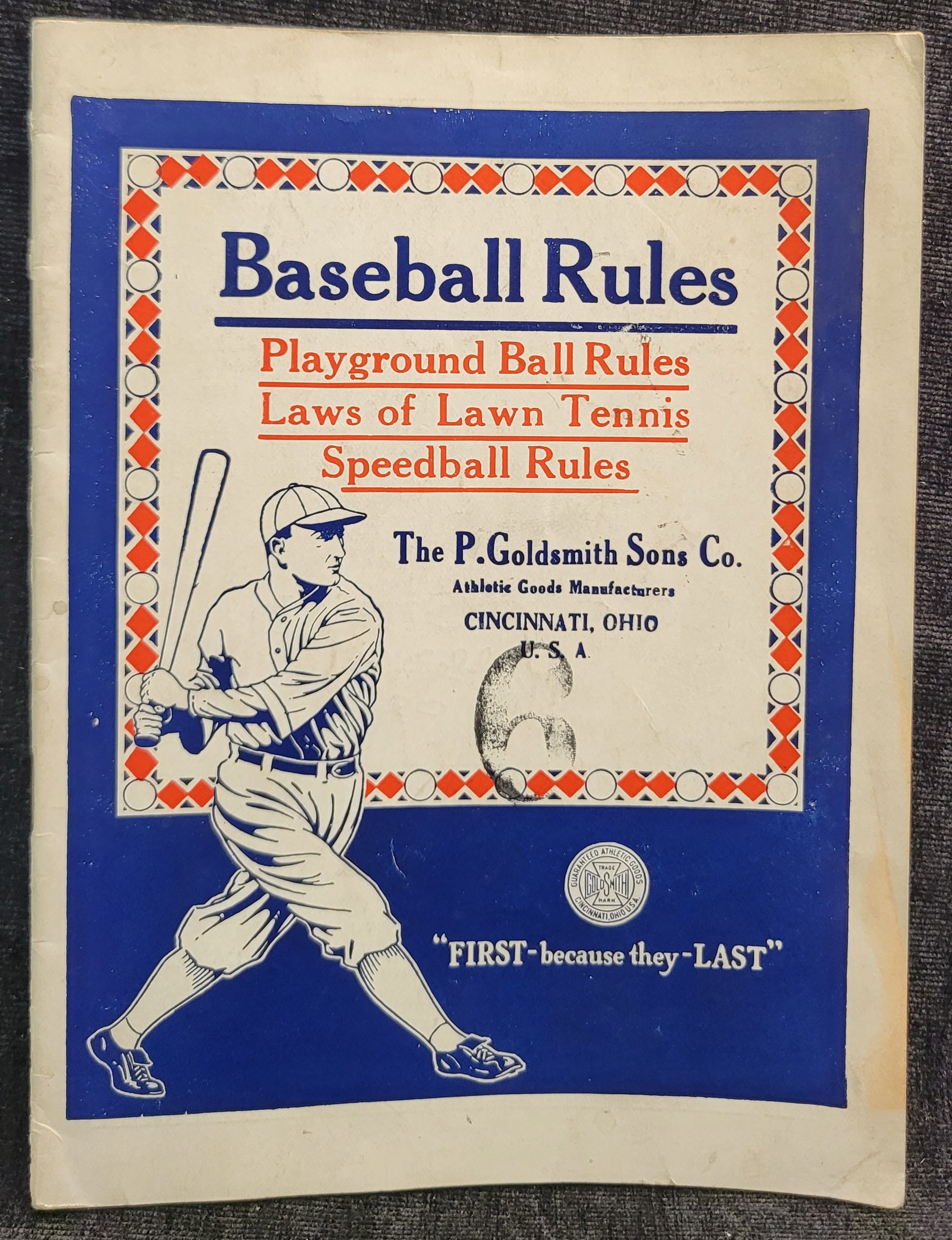 This 1929 edition of Goldsmith's Baseball Rules is in very good condition. There is mild staining on both the front and back cover as well as a stamped number 6 on the front, but otherwise show little signs of use or fraying. The Goldsmith logo on the front cover was used by the company between the years of 1926 and 1933.