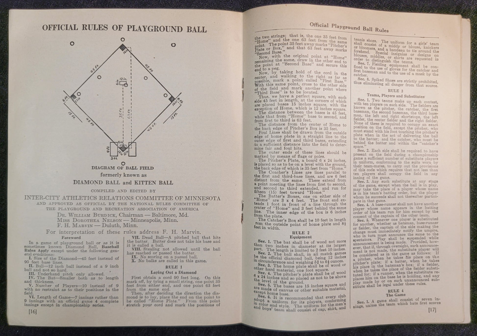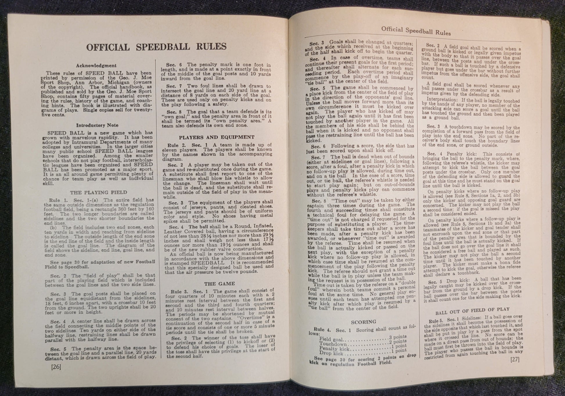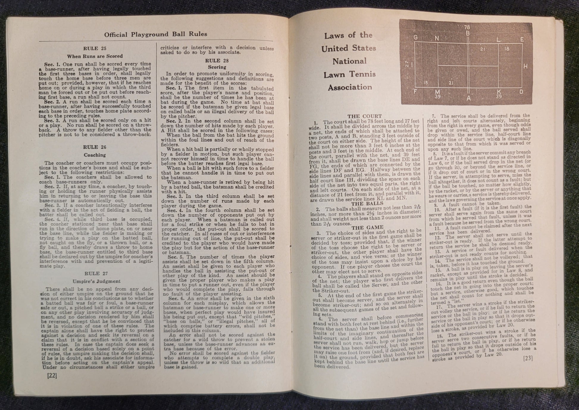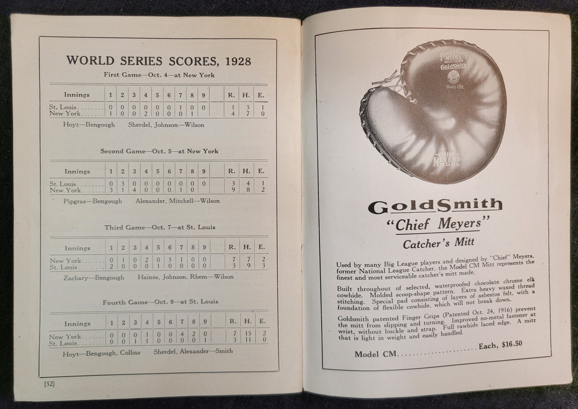 This 1929 edition of Goldsmith's Baseball Rules is in very good condition. There is mild staining on both the front and back cover as well as a stamped number 6 on the front, but otherwise show little signs of use or fraying. The Goldsmith logo on the front cover was used by the company between the years of 1926 and 1933.