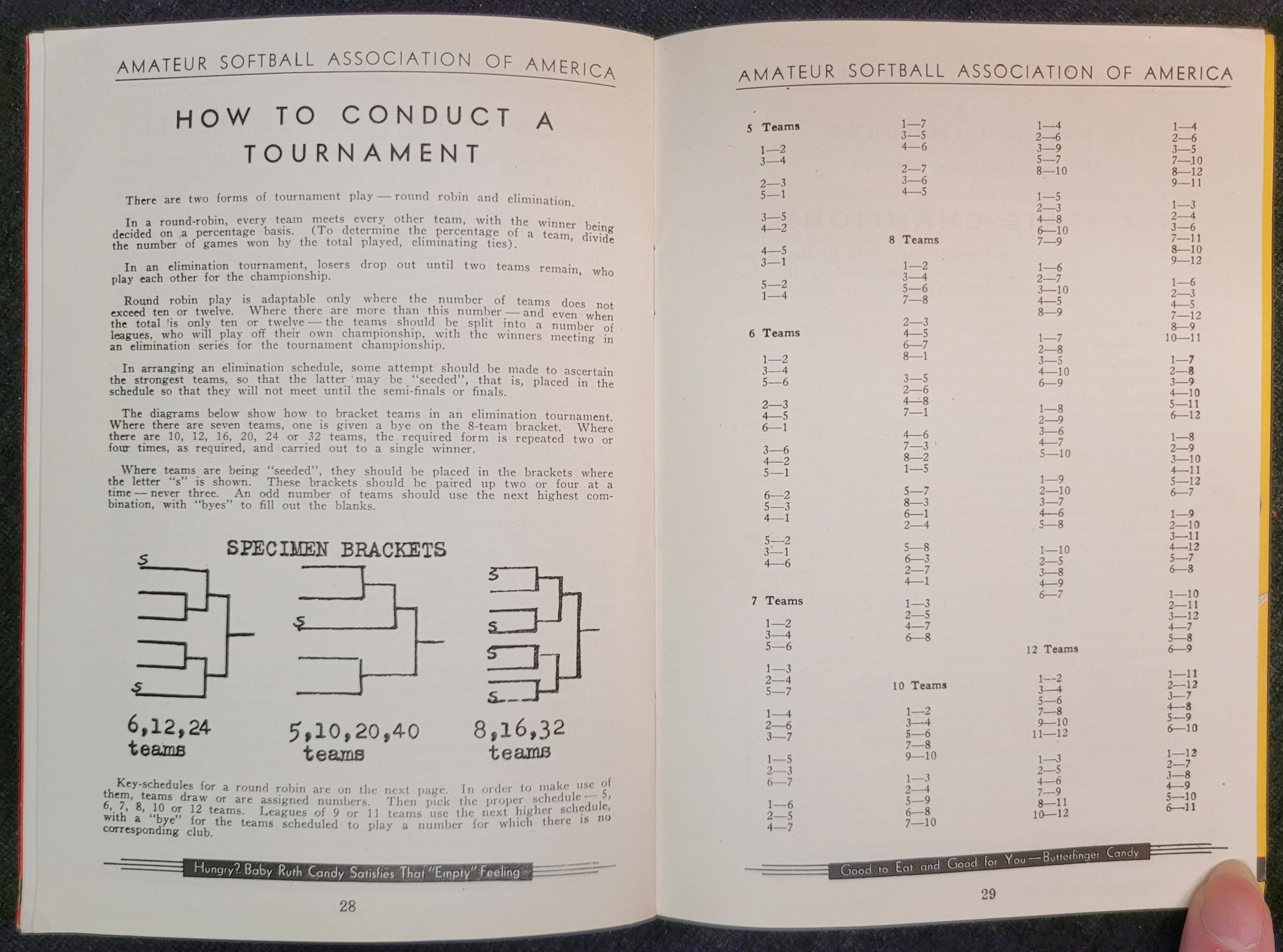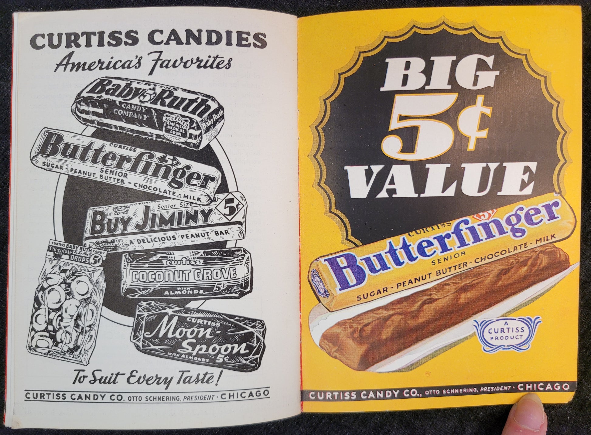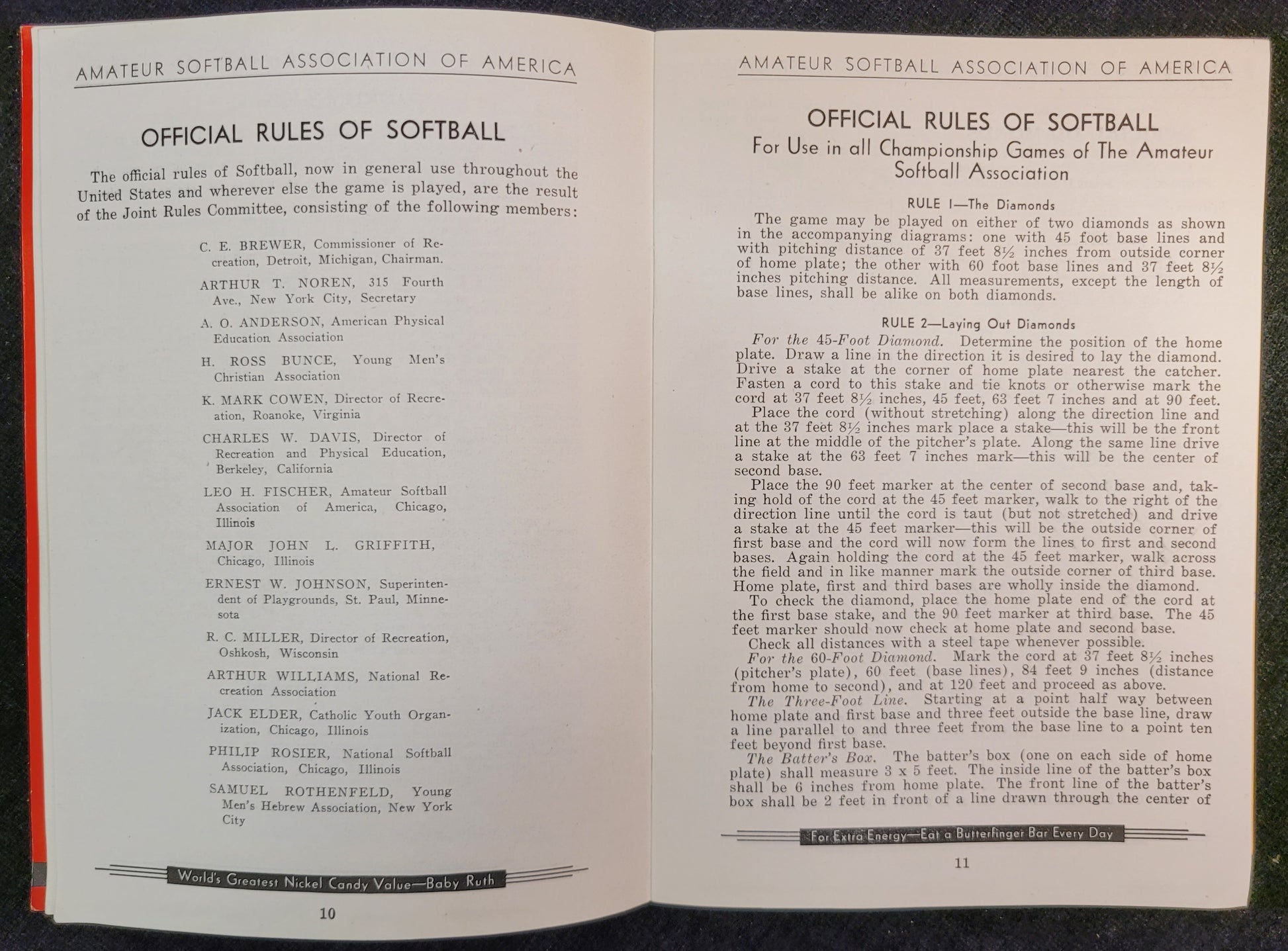 This softball rule book was published by the Curtiss Candy Company in 1934. The Curtiss Candy Co was a confectionery brand founded in 1916 by Otto Schnering. Their first product was originally called "Kandy Kake," which would later be rebranded to the iconic "Baby Ruth" in 1920. The book itself is in excellent condition with vibrant colors and minimal signs of aging or discoloration.