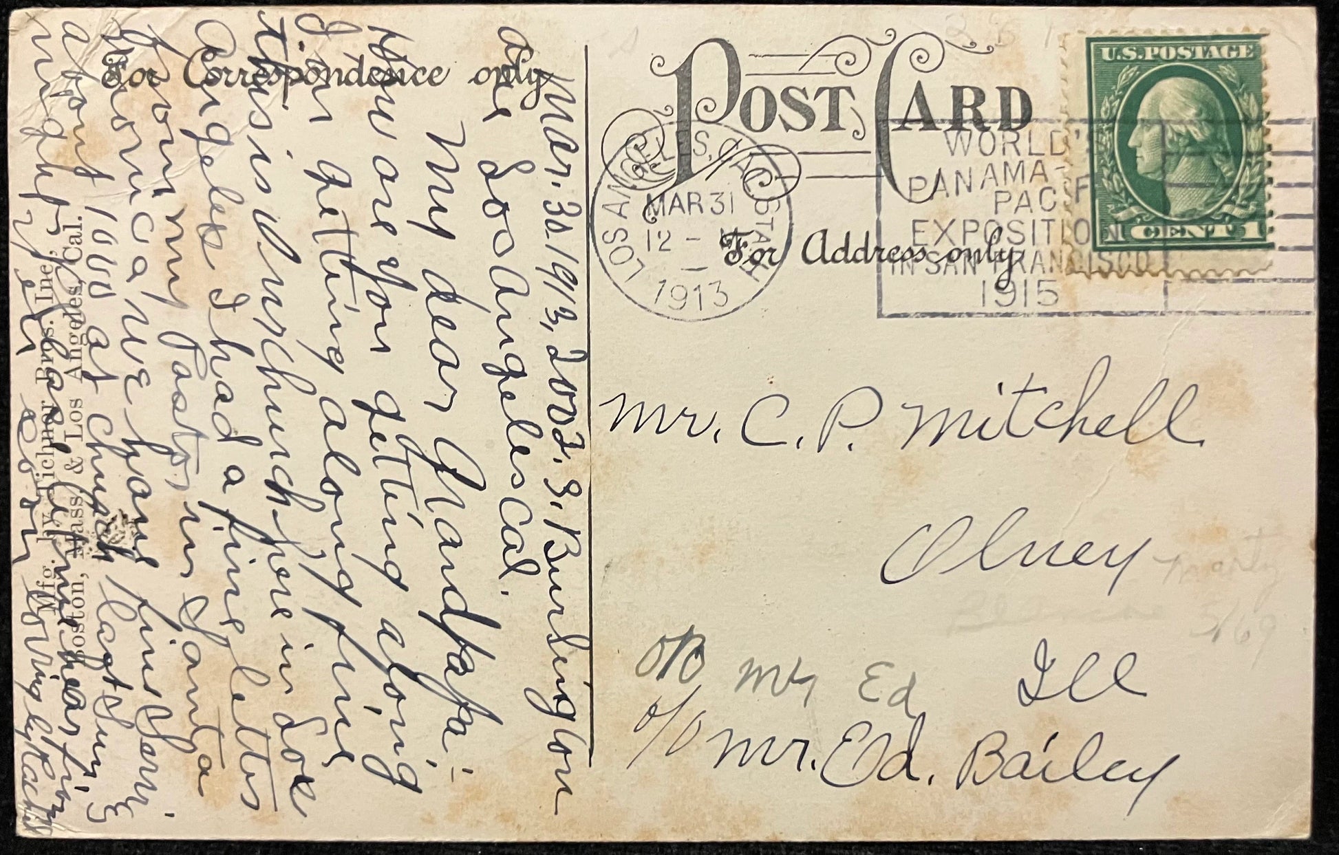 Mailed: Postmark 1913 green one cent George Washington stamp