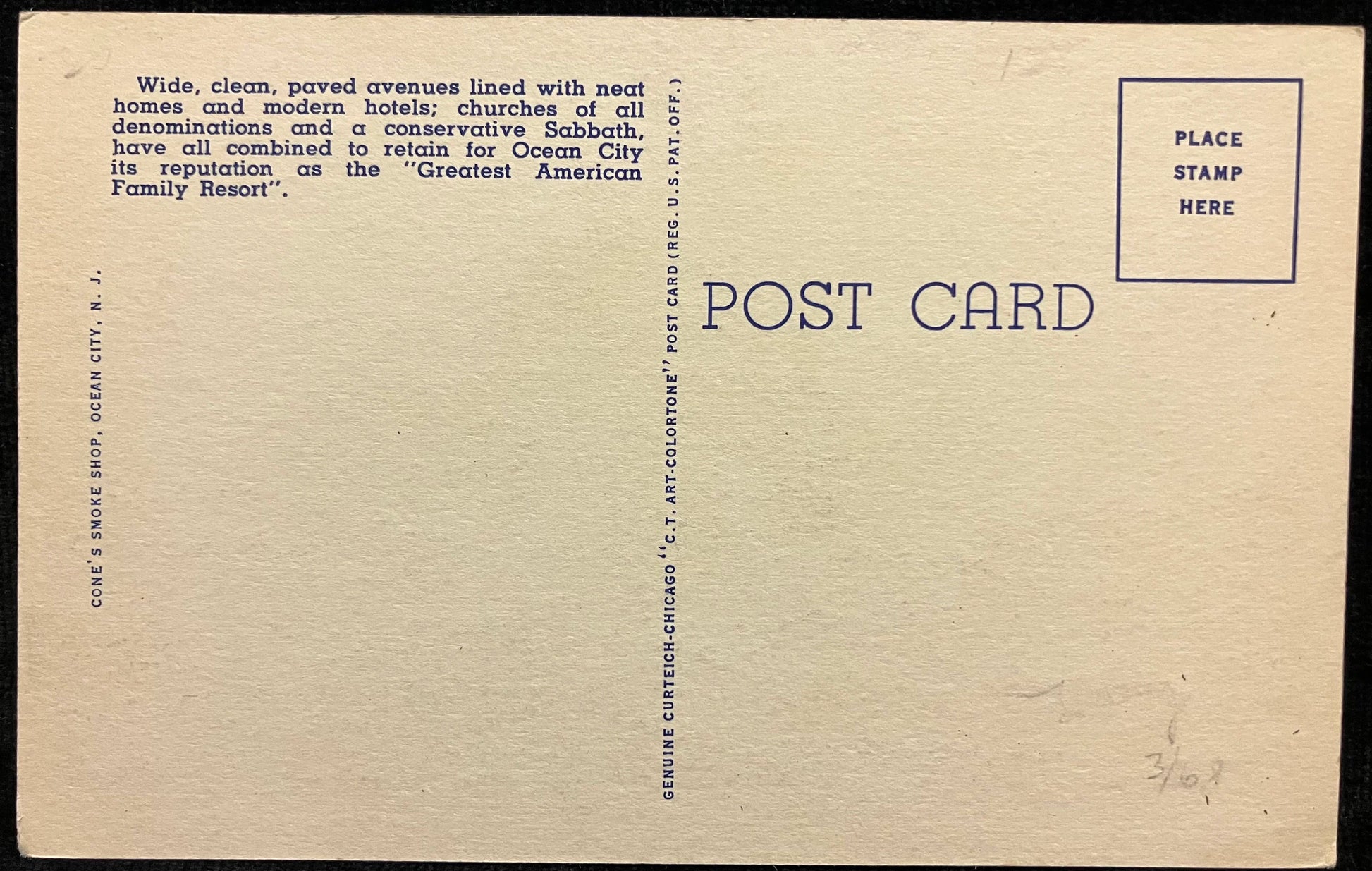 Back: Wide, clean, paved avenues lined with neat homes and modern hotels; churches of all denominations and a conservative Sabbath, have all combined to retain for Ocean City its reputation as the "Greatest American Family Resort"