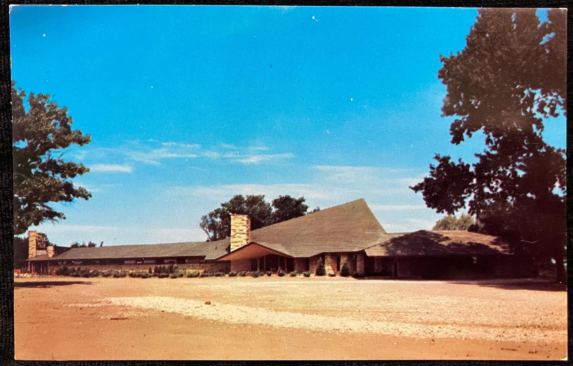 Back: Southern exposure of the meeting House, First Unitarian Society of Madison, Wisconsin; Franklin Lloyd Wright, Architect. Classrooms on the left, main entrance on the right, hearth room and auditorium in the center. The native stone was hauled by Parish members.