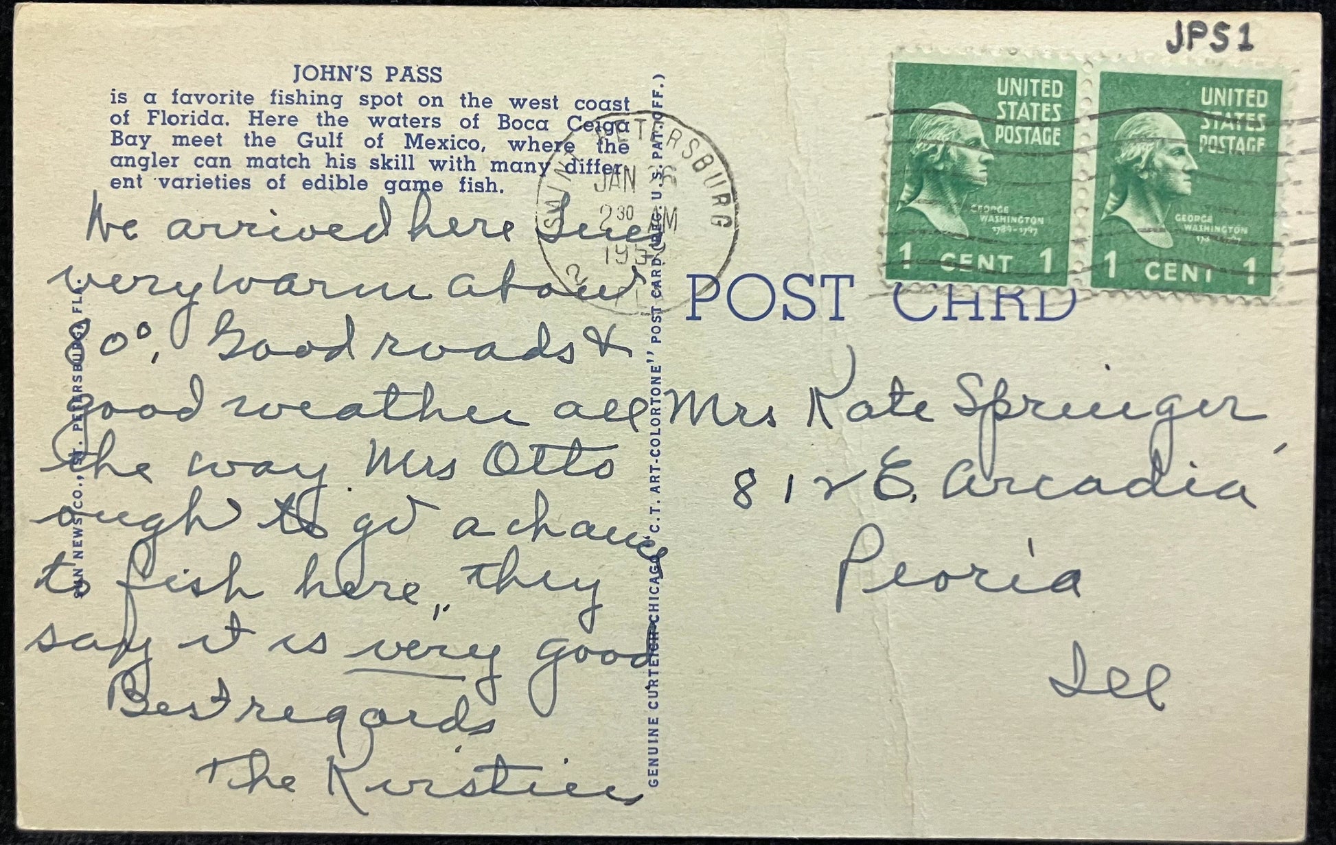 Mailed: Postmark on Jan 26, 1956, from Saint Petersburg, FL, with two green one-cent George Washington stamps