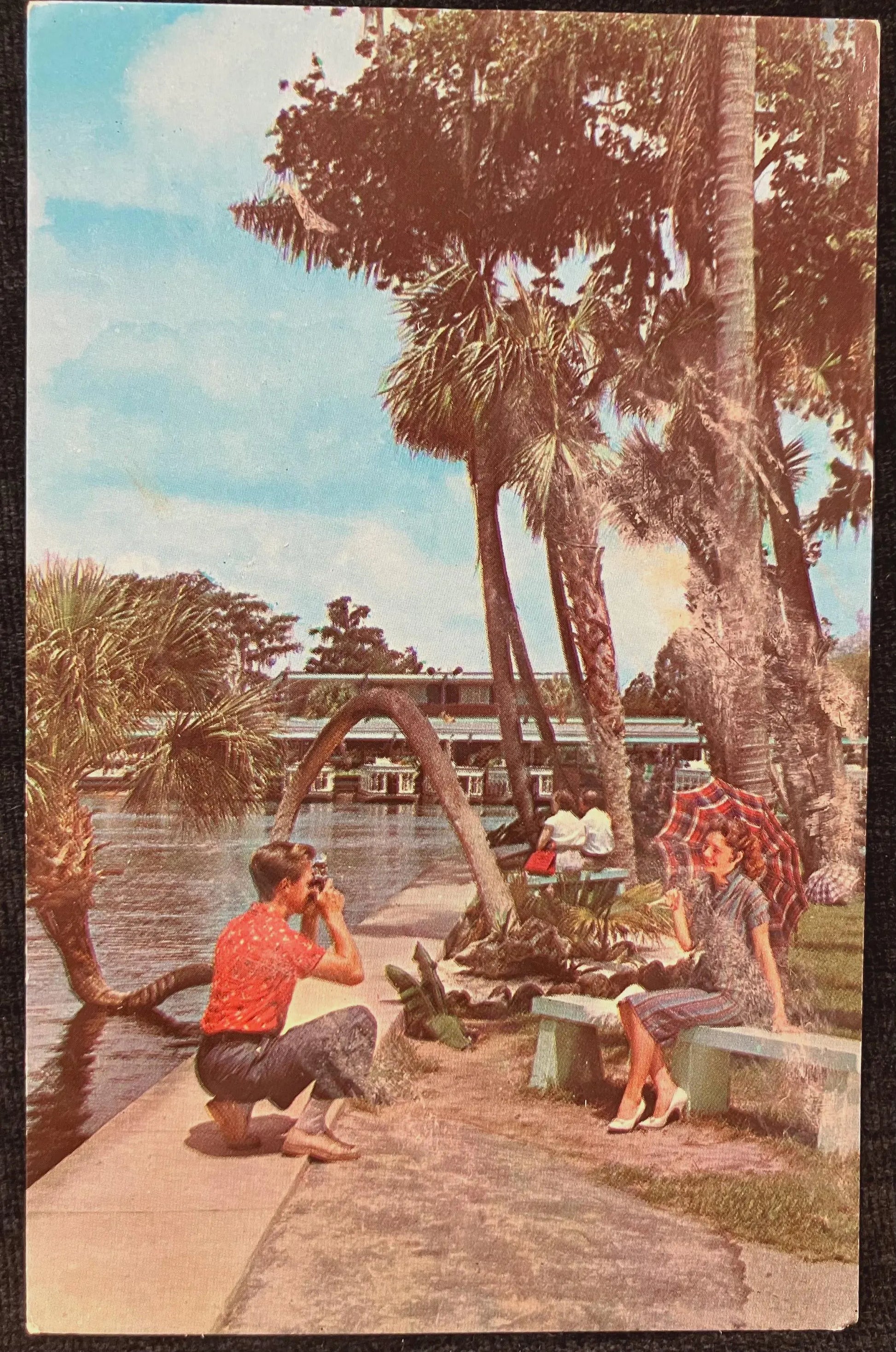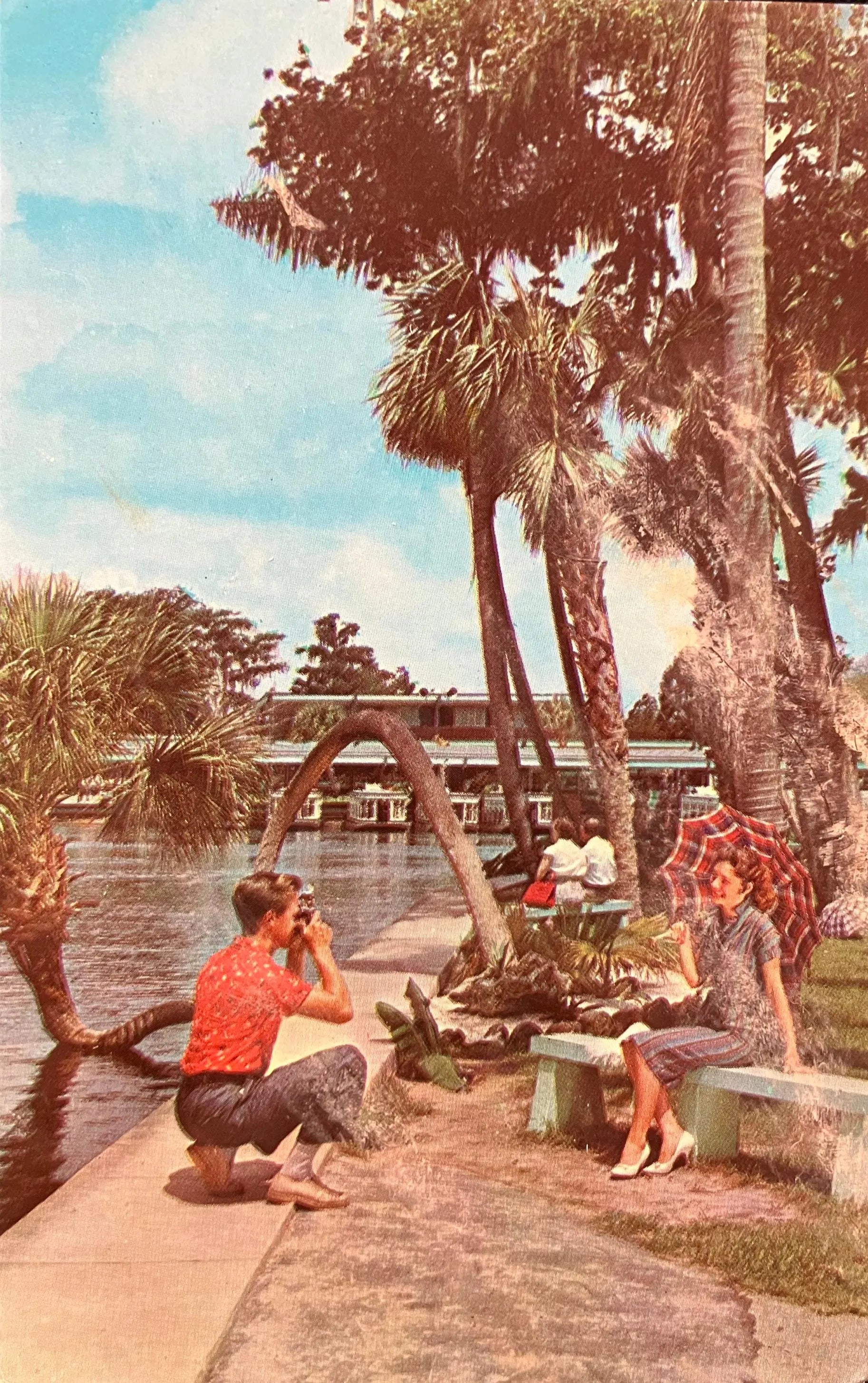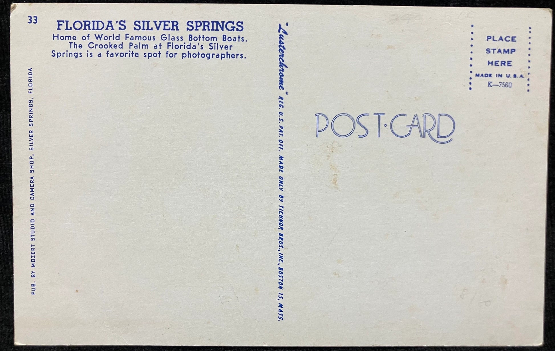 Back: FLORIDA’S SILVER SPRINGS Home of World’s Famous Glass Bottom Boats. The Crooked Palm at Florida’s Silver Springs is a favorite spot of photographers.