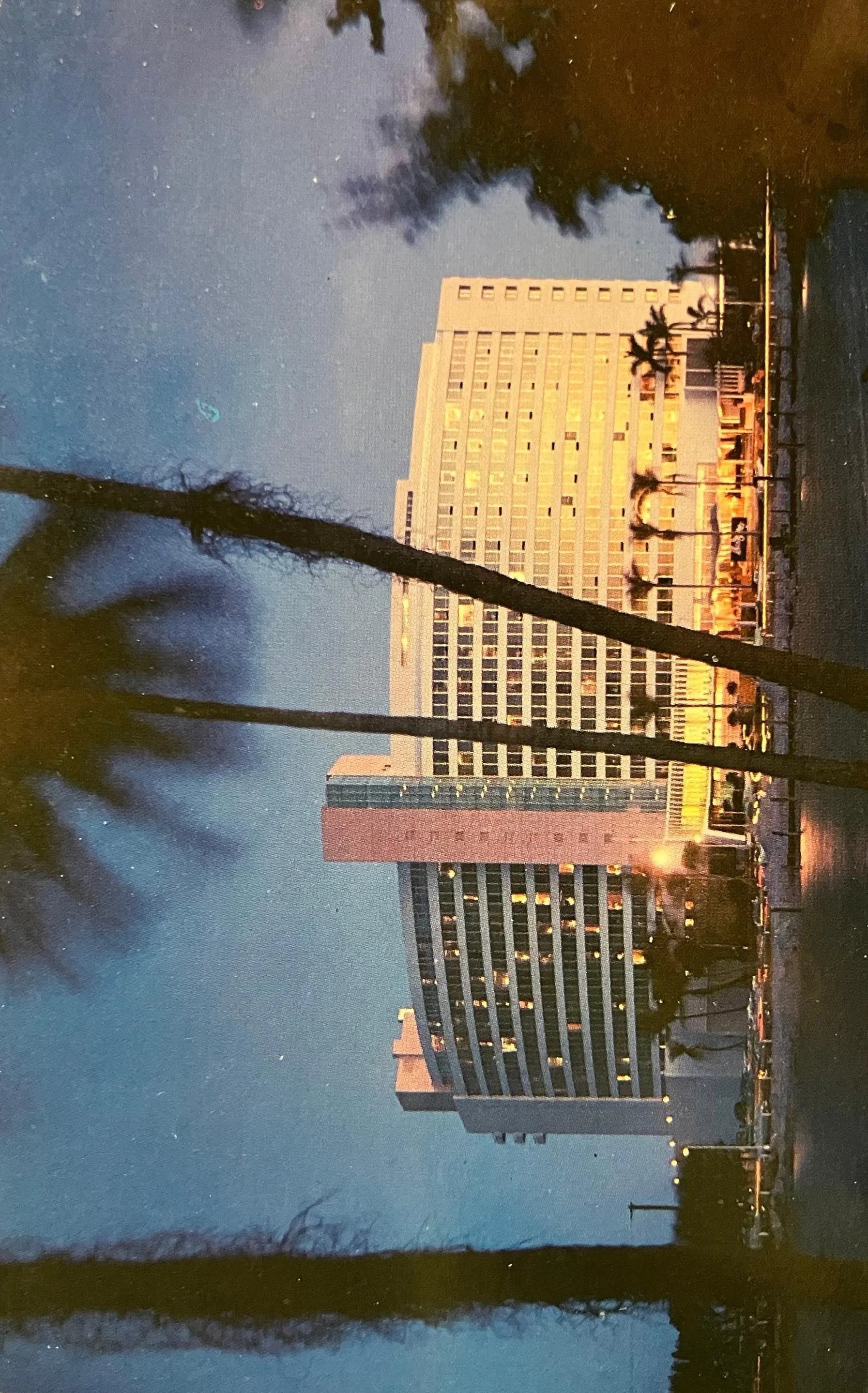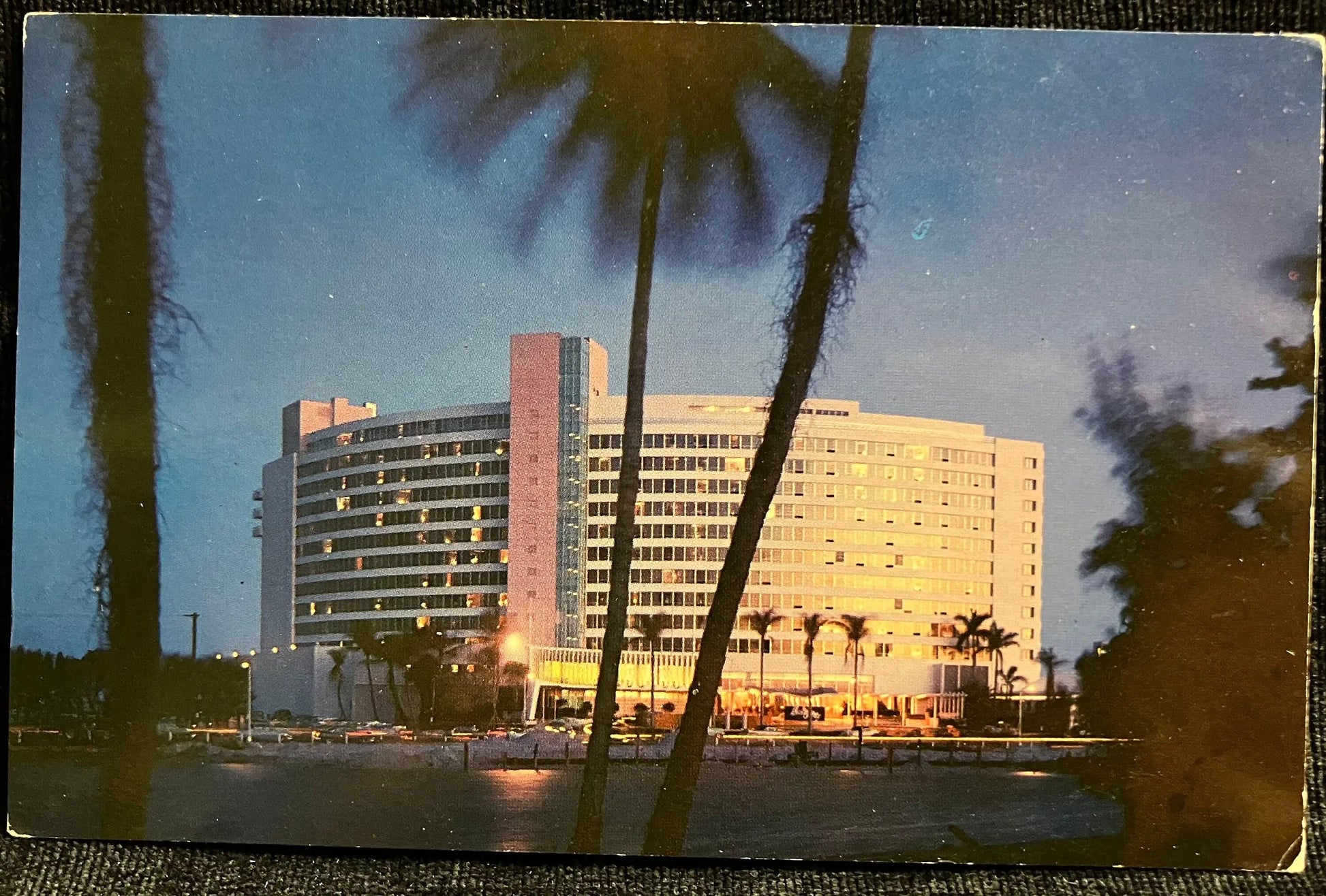 Back: The fabulous new Fontainebleau Hotel, flittering like a a jewel in the tropical night at Miami Beach, Florida.