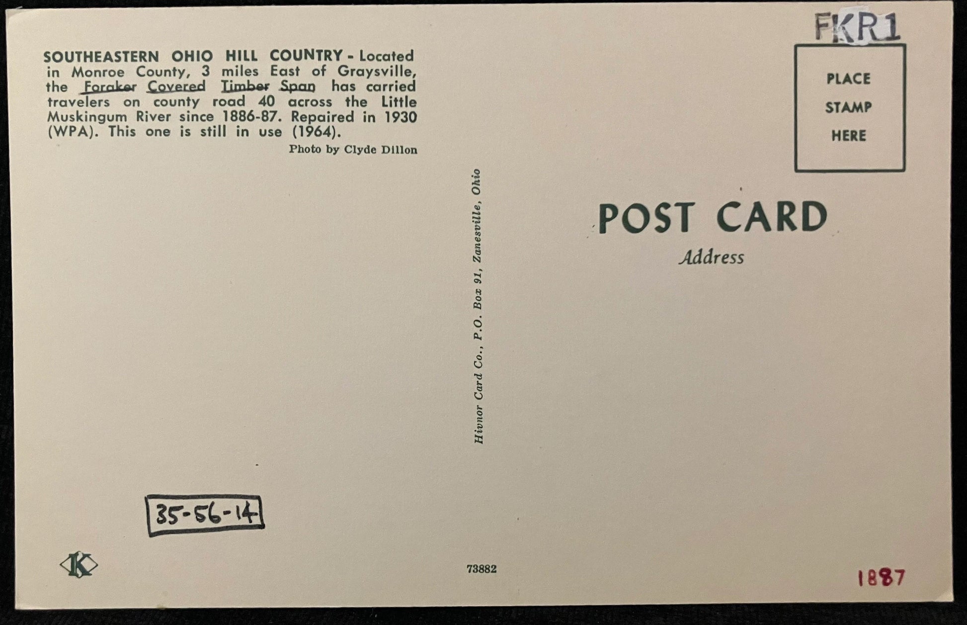 Back: SOUTHEASTERN OHIO HILL COUNTRY - Located in Monroe County, 3 miles East of Graysville, the Foraker Covered Timber Span has carried travelers on county road 40across the Little Muskingum River since 1886-87. Repaired in 1930 (WPA). This one is still in use (1964).