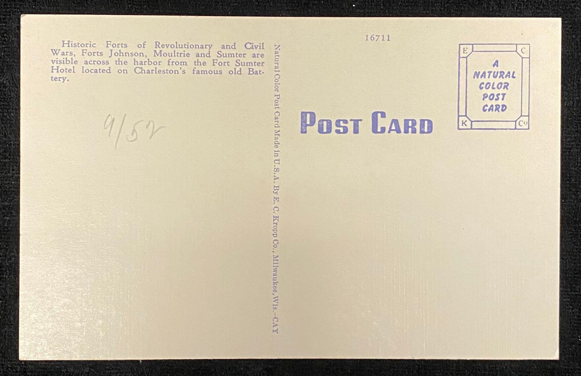 Back Information: "Historic Forts of Revolutionary and Civil Wars, Forts Johnson, Moultrie and Sumter are visible across the harbor from the Fort Sumter Hotel located on Charleston's famous old Battery."