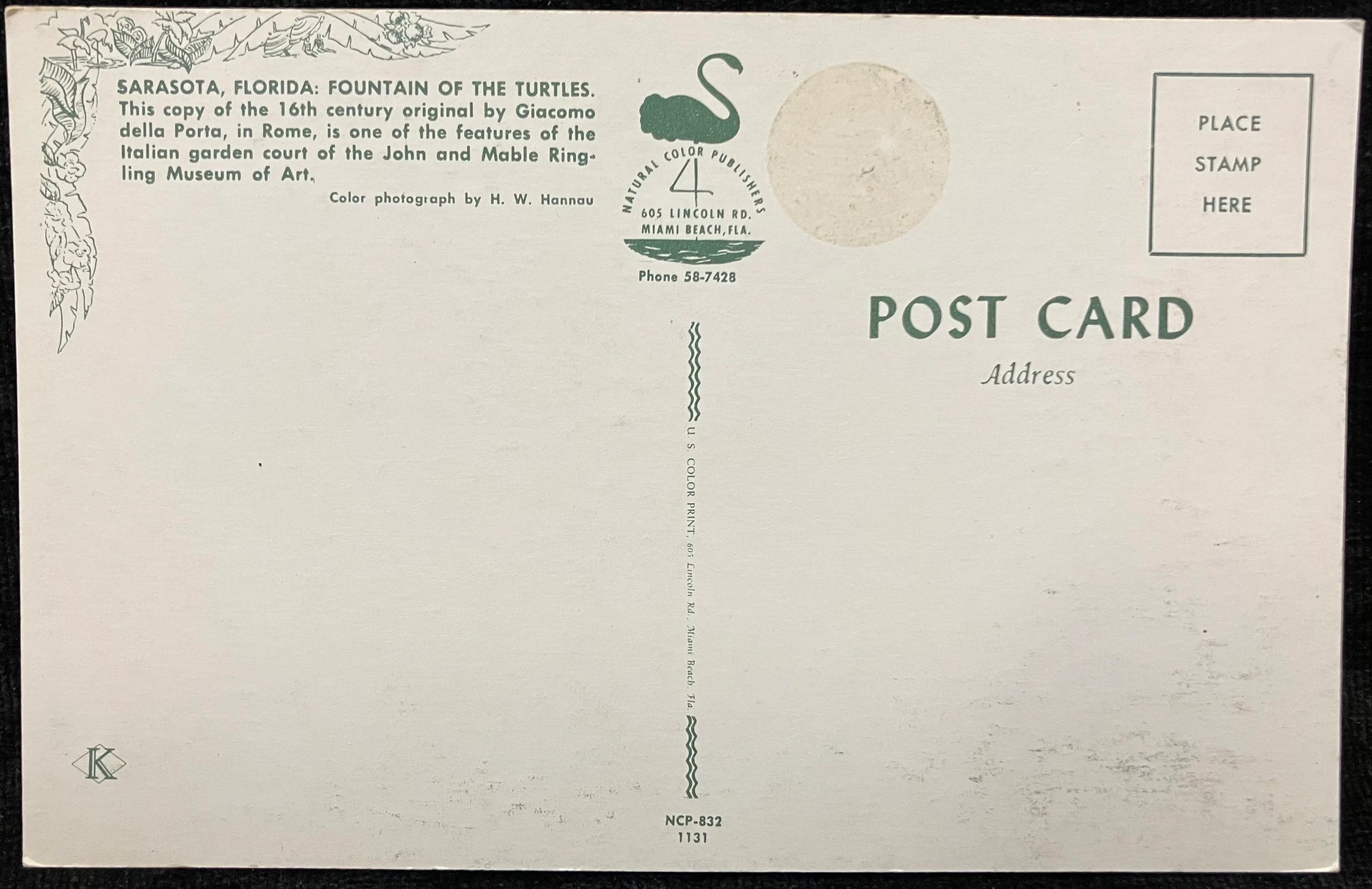 Fountain of the Turtles in Sarasota, Florida - Photo: H. W. Hannau - Vintage Musuem Postcard
